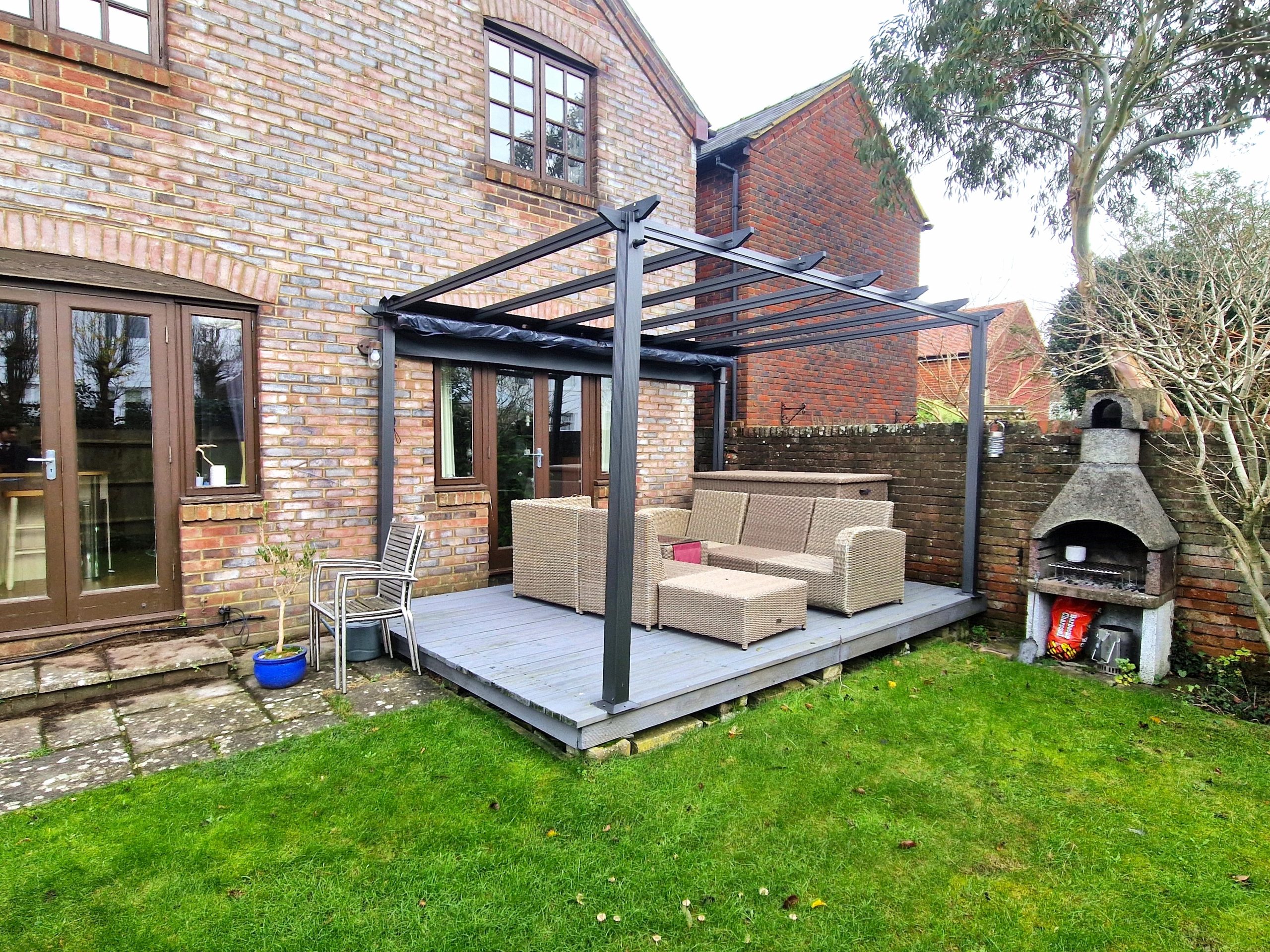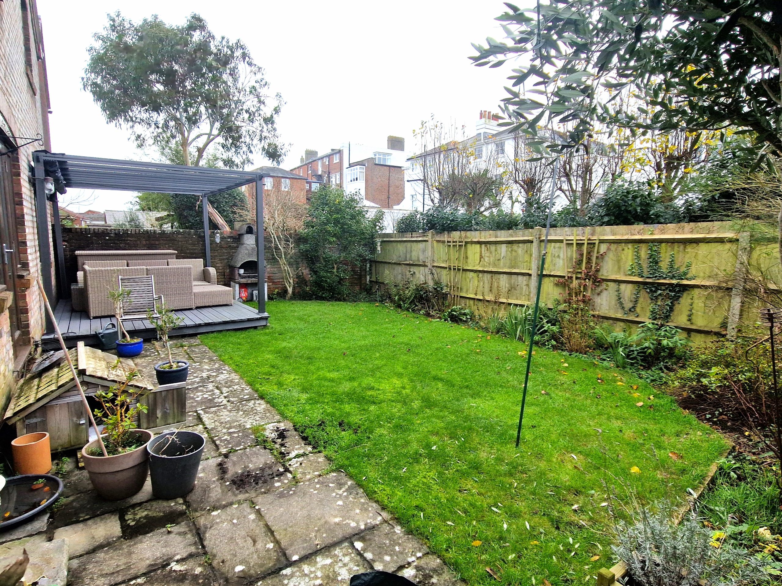 Southerly facing rear garden, mainly laid to lawn with flower and shrub borders, patio area and raised timber decking with pergola. Timber fencing and walling, side gate leading to front. Water tap, log store, personal side door to garage, outside power point. Front parking area laid to paving.