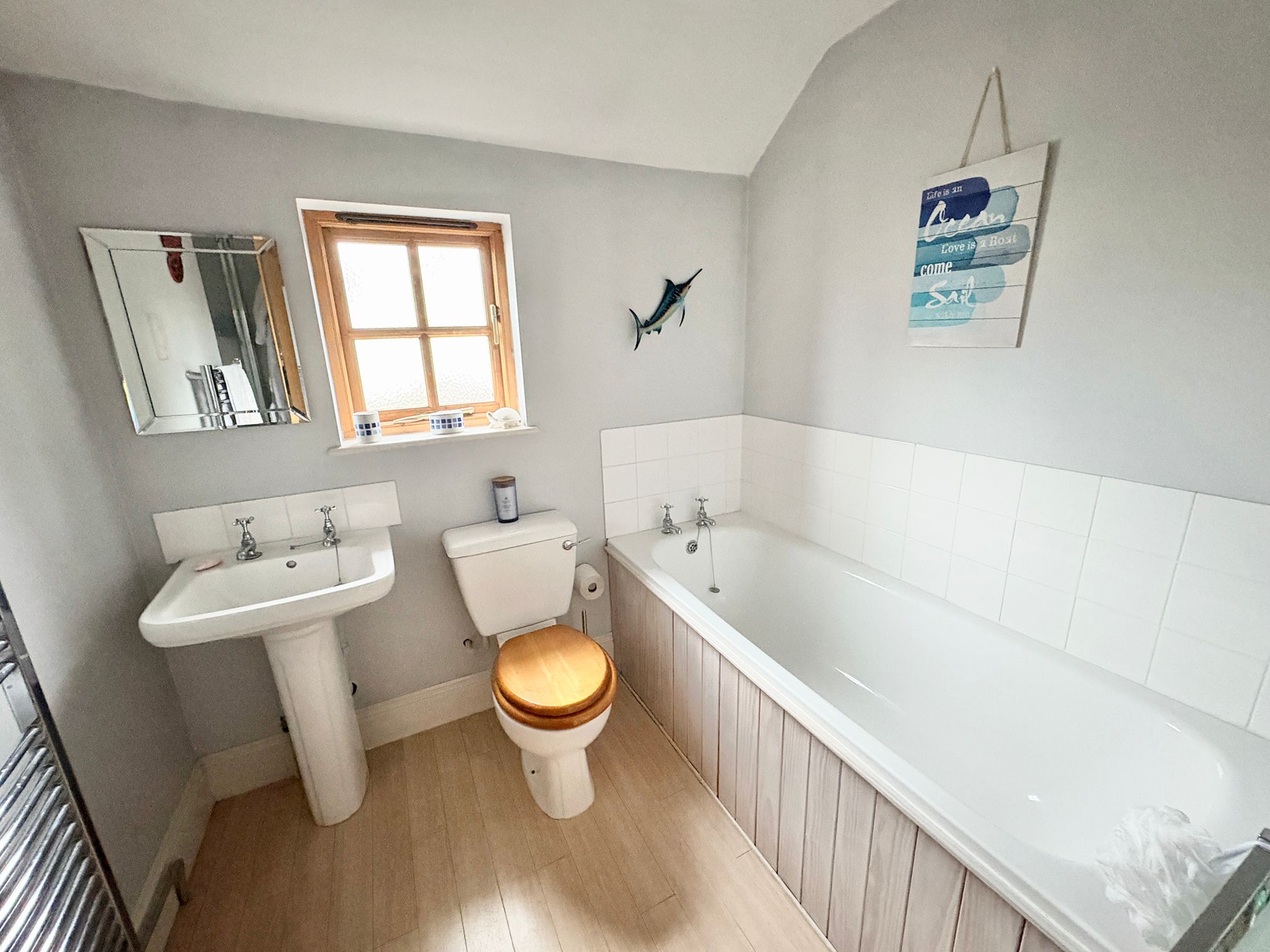 7’11 (2.41m) x 5’7 (1.70m), shower, WC, double length sink with storage under and tile splash back, heated chrome towel rail, half tiled walls and laminate style floor.