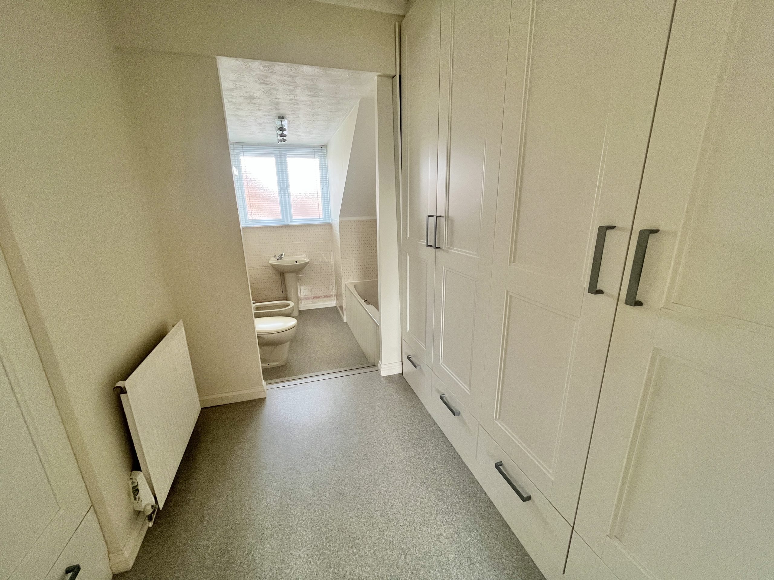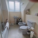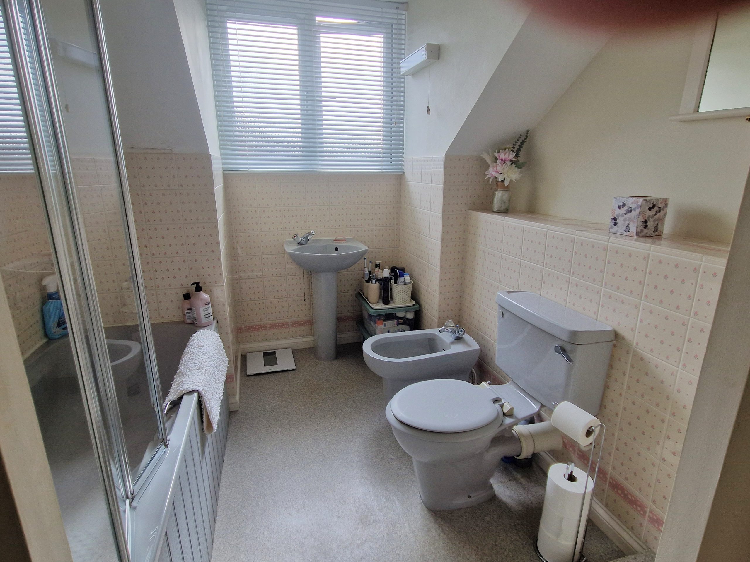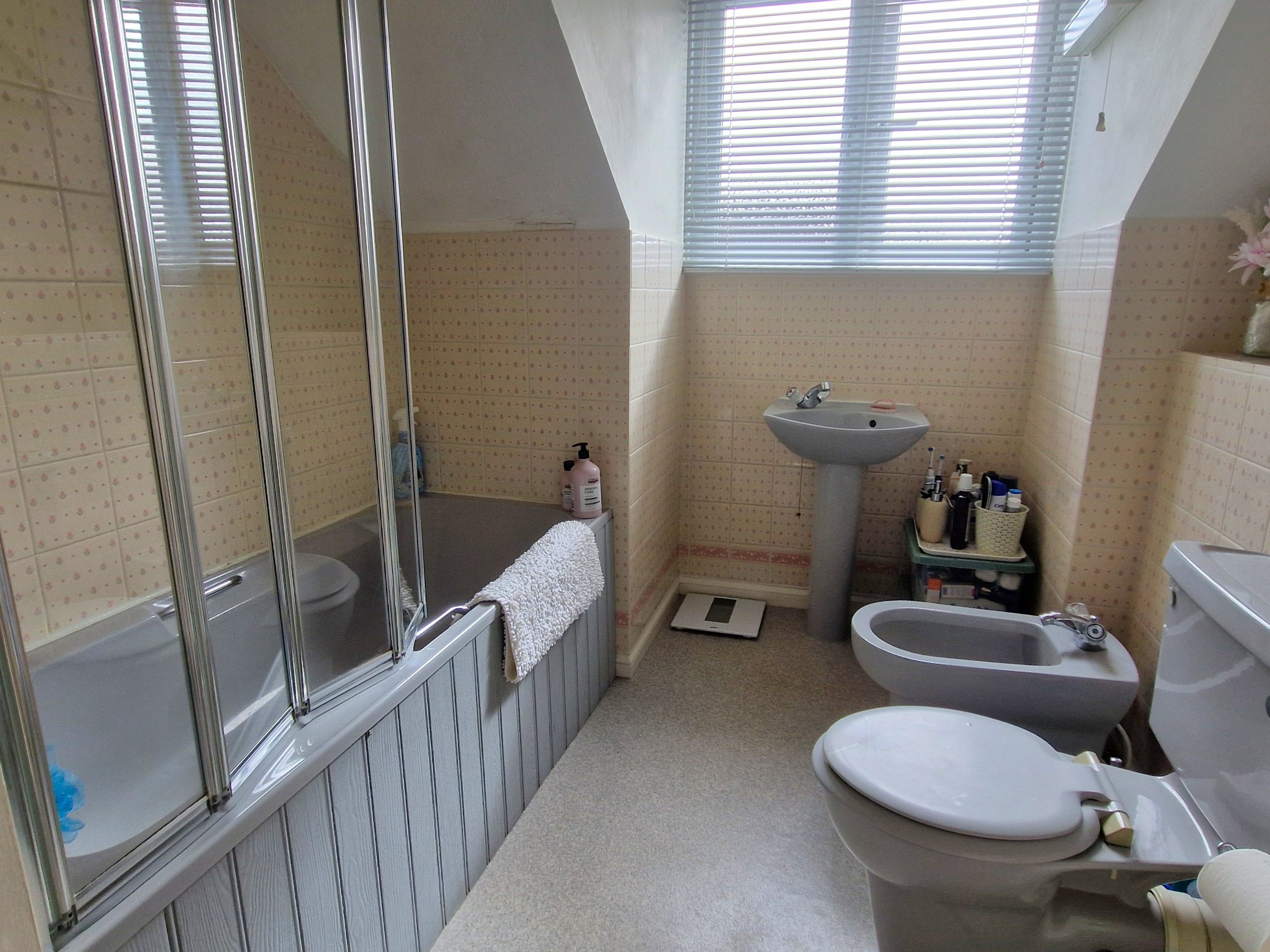 11’1(3.4m) x 7’7 (2.3m), bath with shower attachment and screen, wash hand basin, WC, bidet, part tiled walls, radiator, vinyl style flooring and airing cupboard.