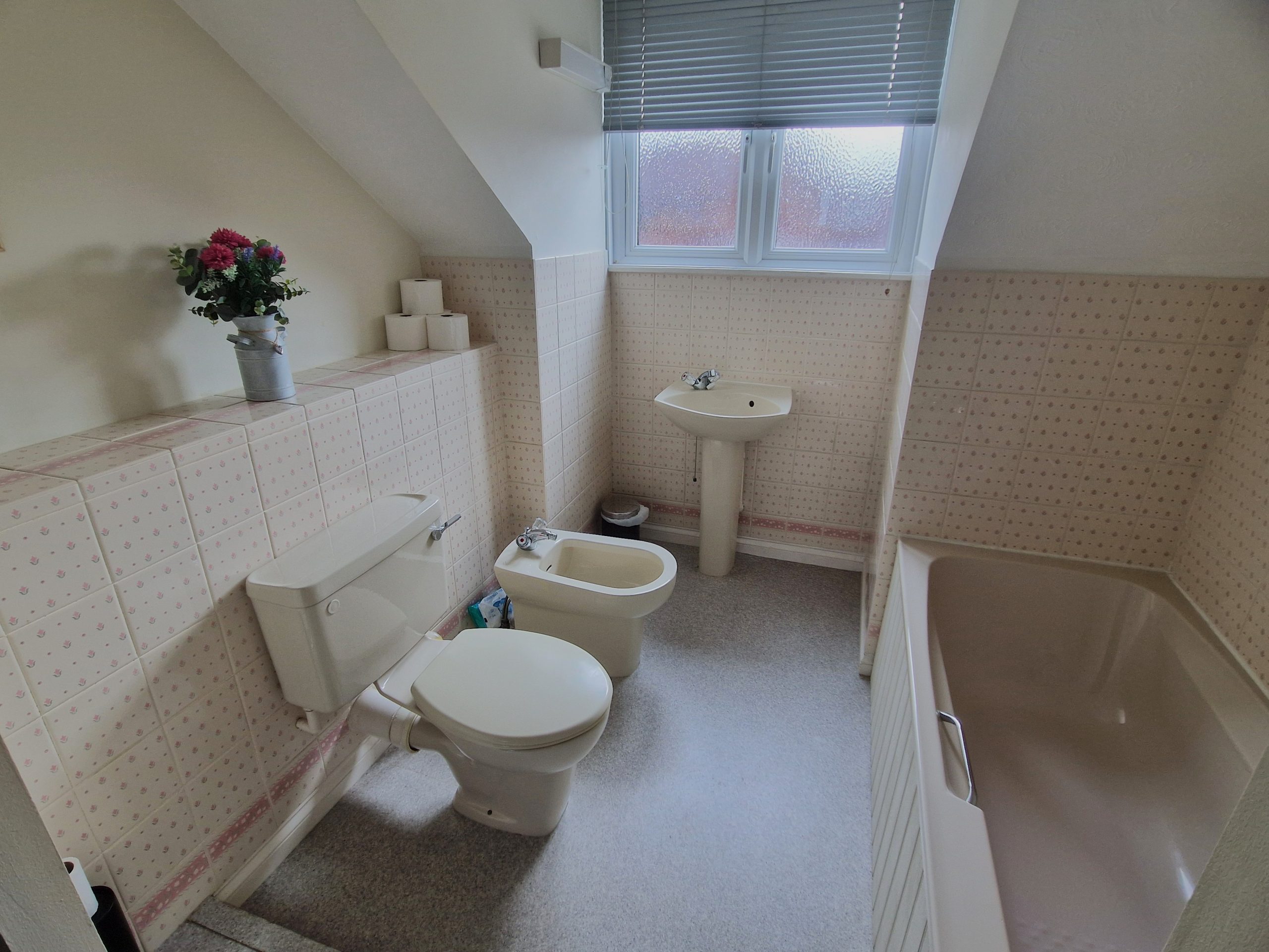 8’1 (2.46m) x 5’1 (1.54m), bath, wash hand basin, WC, bidet, part tiled walls, radiator and vinyl style.