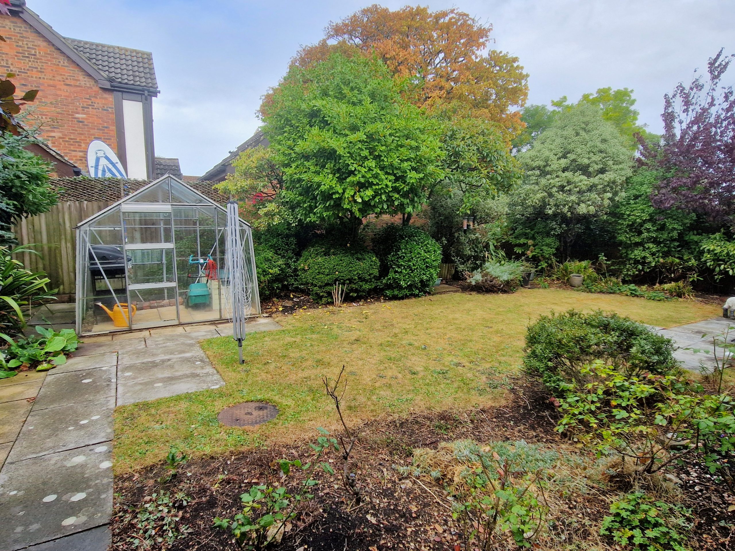 South Westerly facing, lawn area, mature flower and shrub boarders, paved patio areas and pathway, timber fencing and walling, high shrubbery, green house.