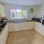 Wall and floor units, worktops, tiled splash backs, sink and drainer with mixer tap, electric hob with cooker hood over, double oven. Space for dishwasher, tiled floor, radiator, spot lighting and wall mounted gas fired boiler.