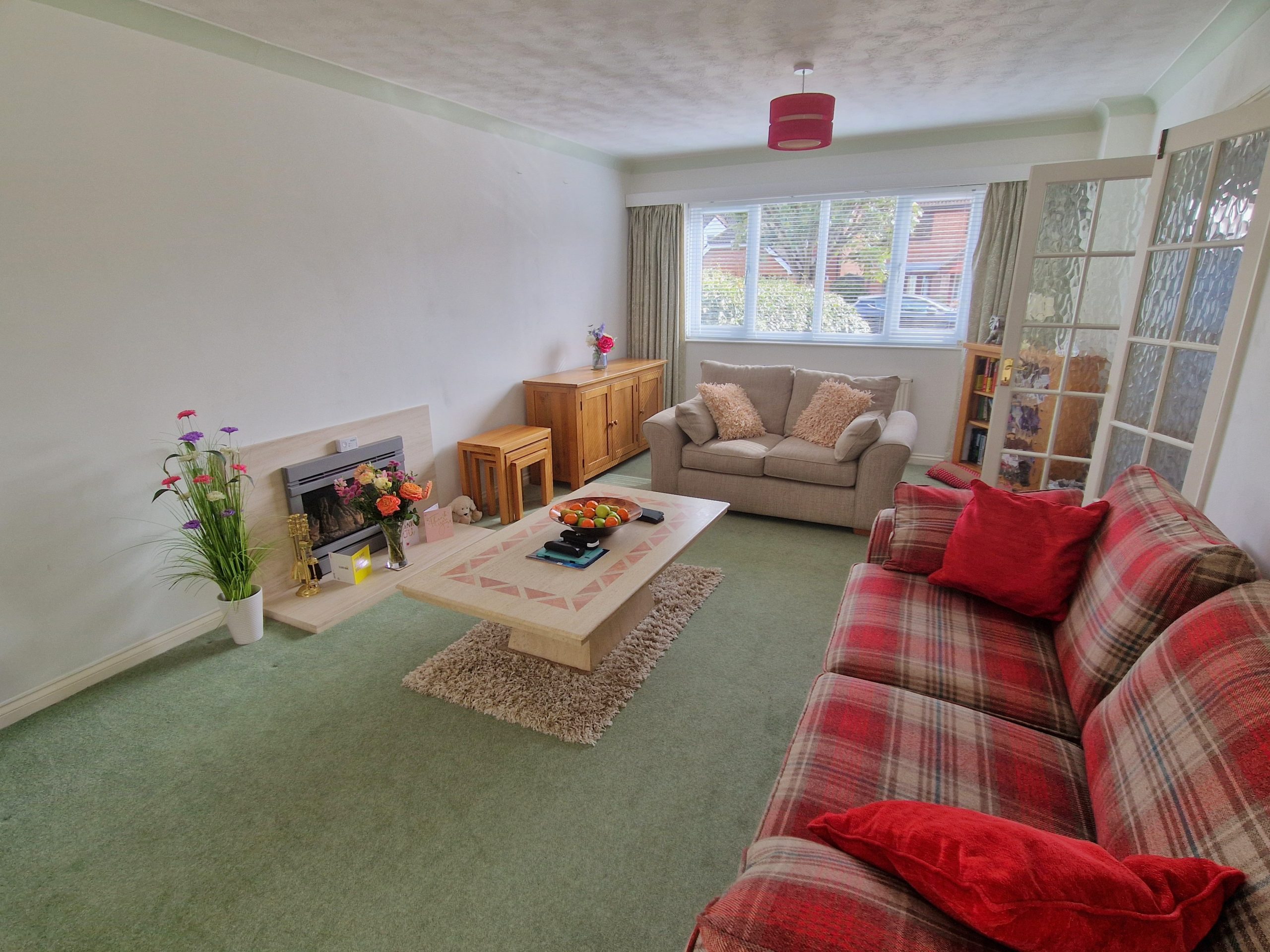 21’1 (6.4m) x 11’8 (3.6m), fire place, two radiators, carpet and patio doors leading to;