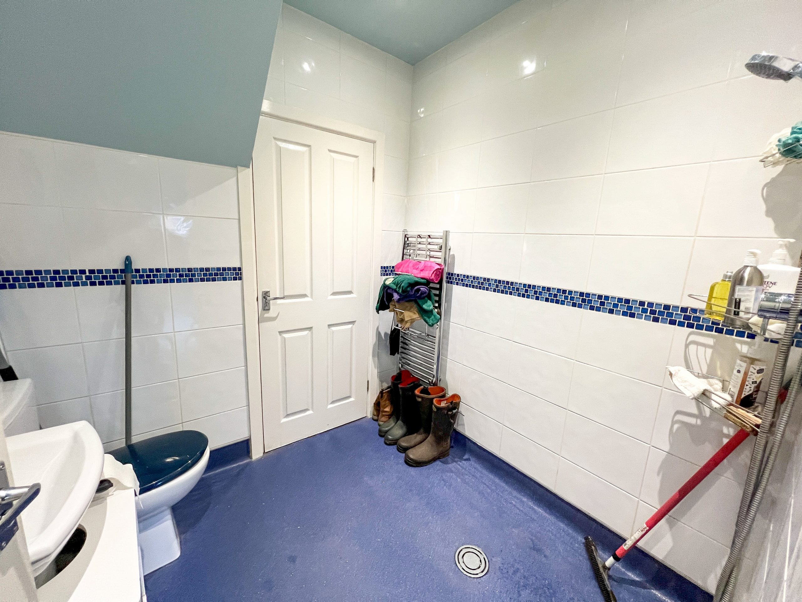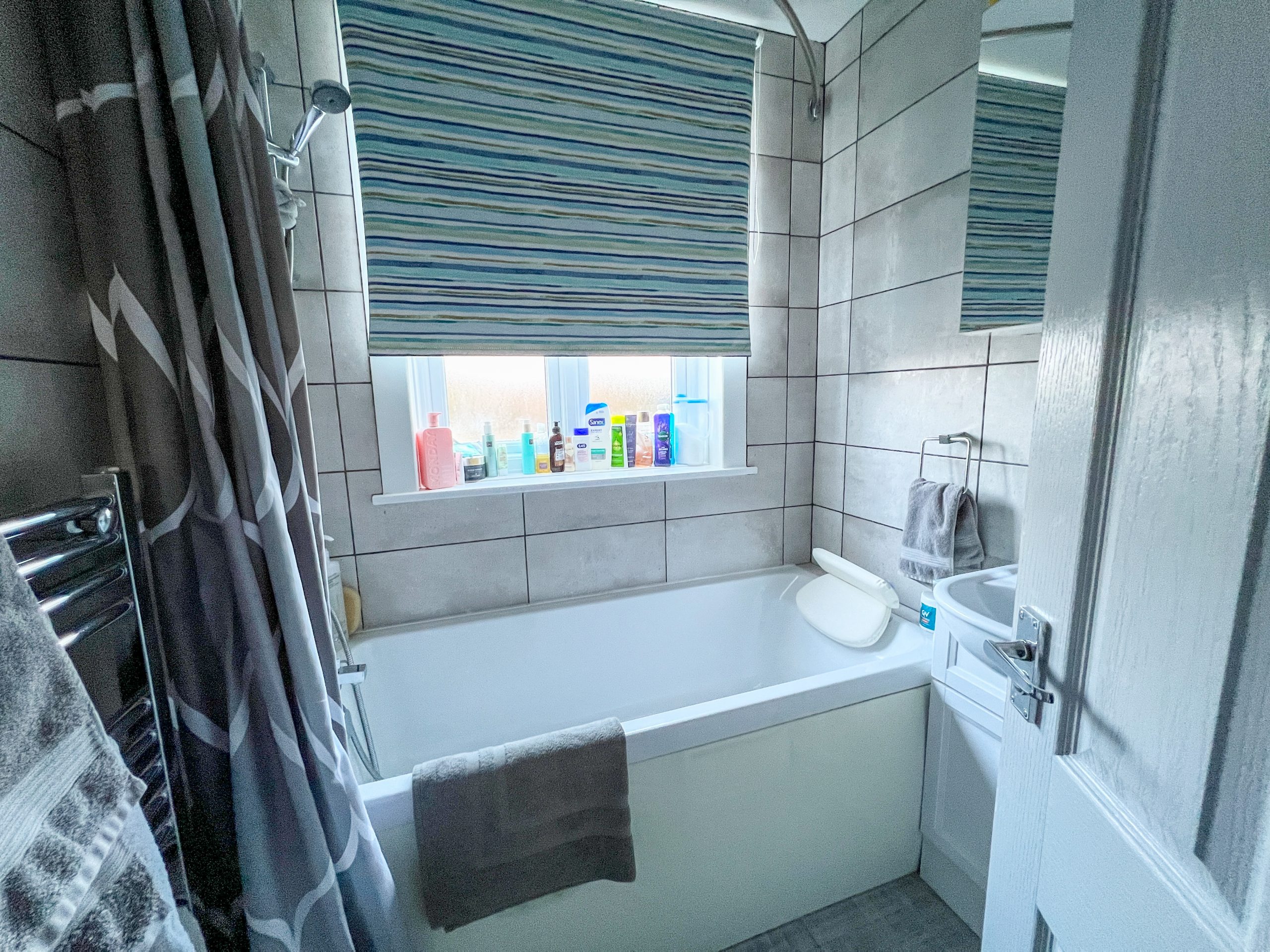 Having been re-fitted with a white suite, comprising a bath, with shower over, tiled walls, pedestal wash hand basin, wc & a heated towel rail. Double glazed window to the rear elevation.