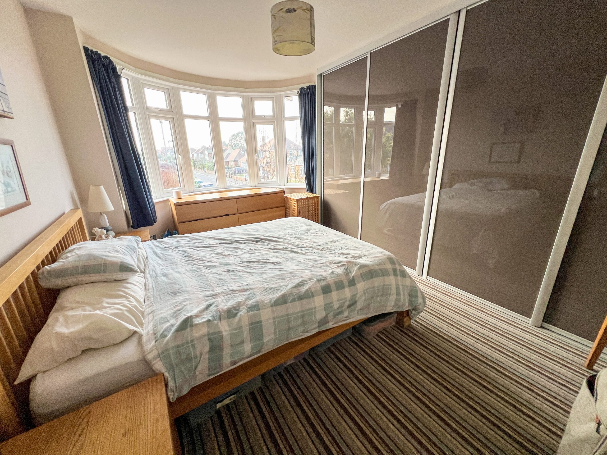 15’5 (4.70m) into bay x 9’8 (2.95m) EXCLUDING range of fitted, floor to ceiling wardrobes & cupboards, with sliding doors. Radiator.