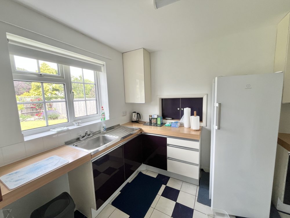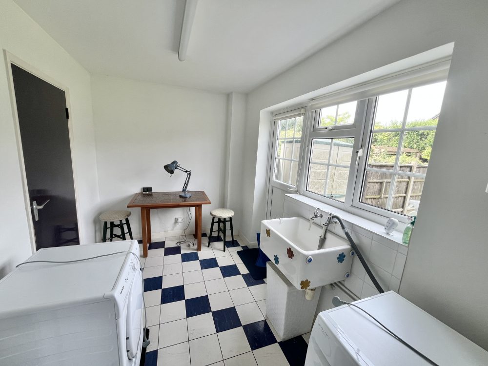 11’10 (3.60m) x 7’ (2.13m), butlers style sink, tiled splash back, plumbing for washing machine, door to garden, gas fired boiler, vinyl flooring and door to garage/workshop.