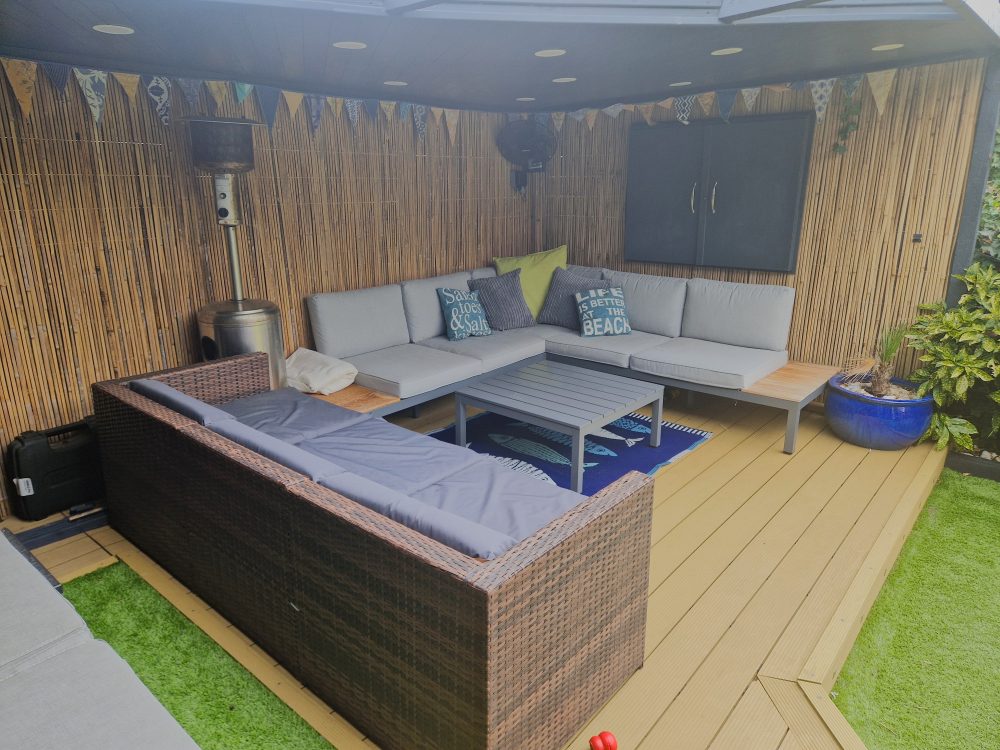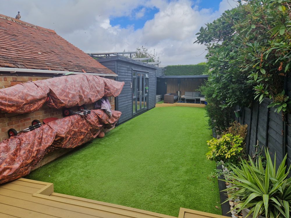 To the rear is an enclosed, low maintenance garden with artificial grass, decked patio areas and flower bed borders. There is an outdoor office/gym 14’00 (4.26m) x 7’04 (2.23m) with power, lighting, air-conditioning and internet access. There is also a covered decking area housing the batteries for the solar system in place, available with sale through negotiation. There is a side access gate leading to the front of the property and large workshop previously used as a garage. 15’05 (4.69m) x 8’00 (2.43m).