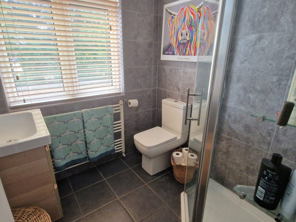 6’04 (1.93m) x 6’00 (1.82m). Freestanding shower, hand wash basin with cupboard under, wc, tile style floor and walls.