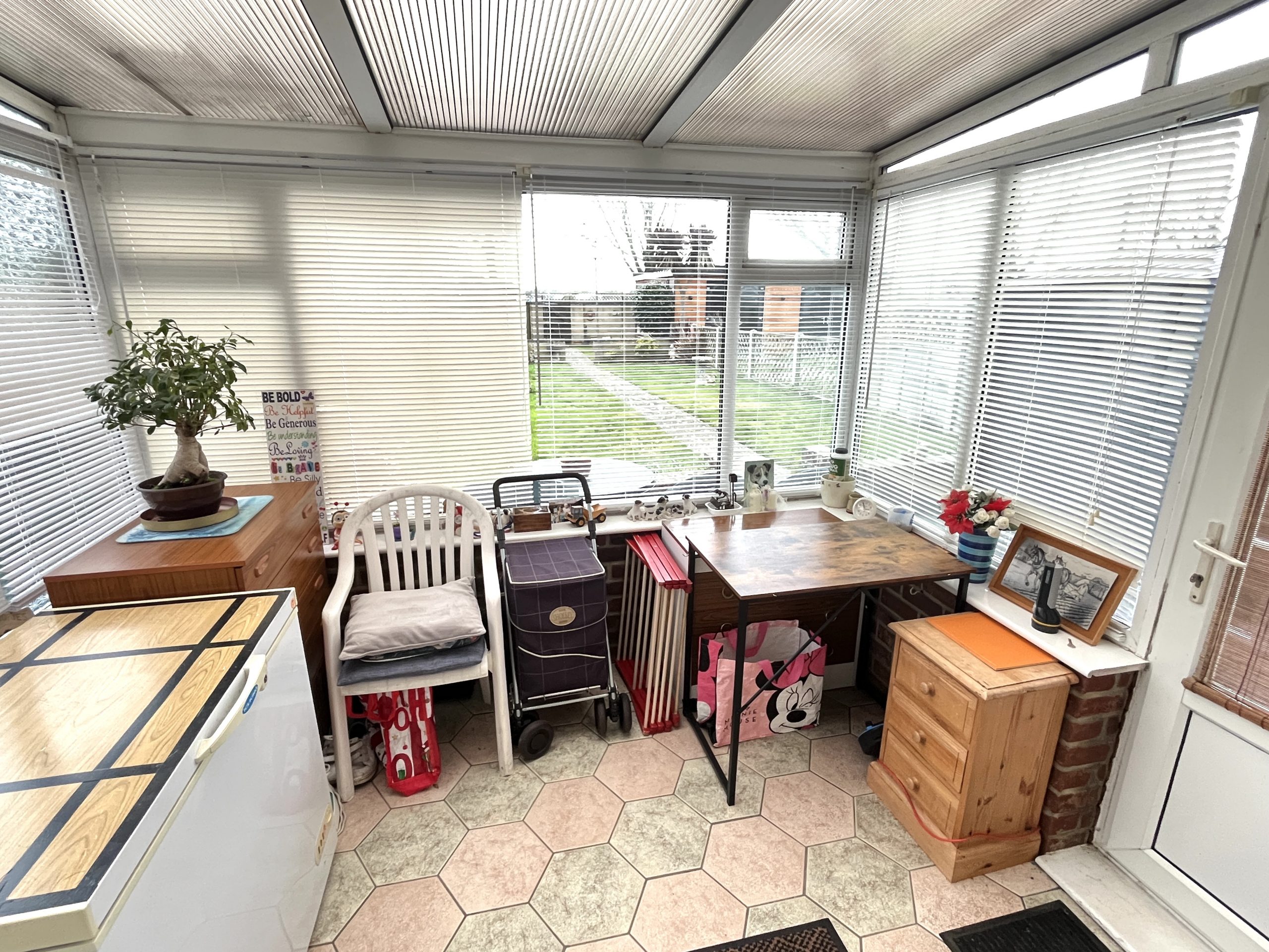 9’ (2.74m) x 7’ (2.22m), UPVC double glazed with polycarbonate style roof, tiled floor and door to garden.