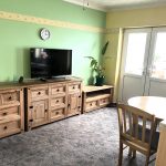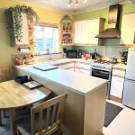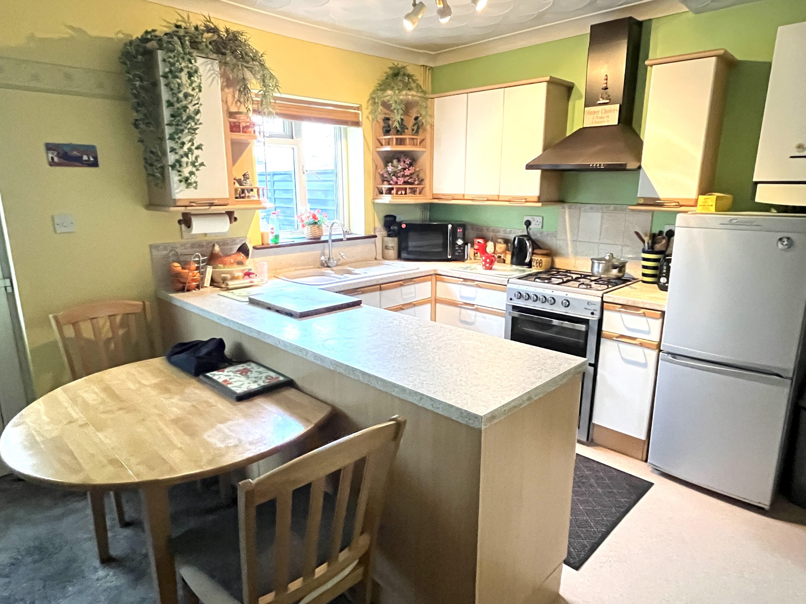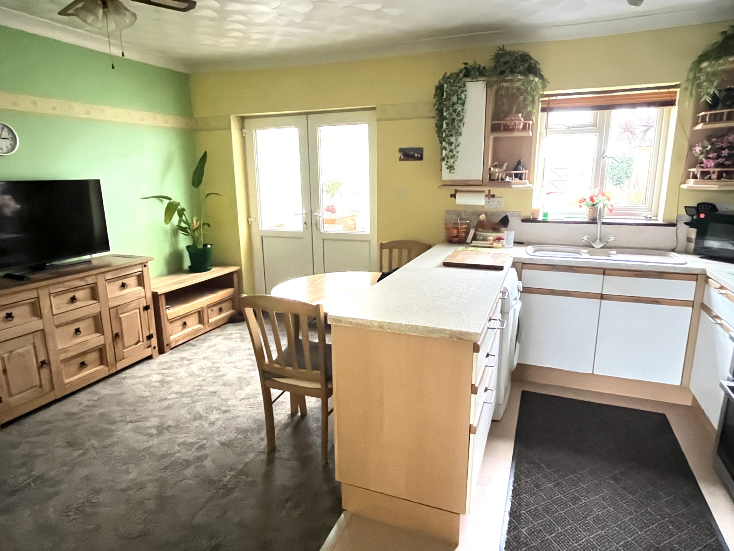 15’10” (4.8m) x 11’11 (3.38m), wall and floor units, works surface, sink and drainer, tiled surrounds. Cooker with hood over, space for fridge/freezer, wall mounted gas fired boiler, under stair cupboard and vinyl style flooring. Dining area; Radiator, carpet and double doors leading to;