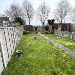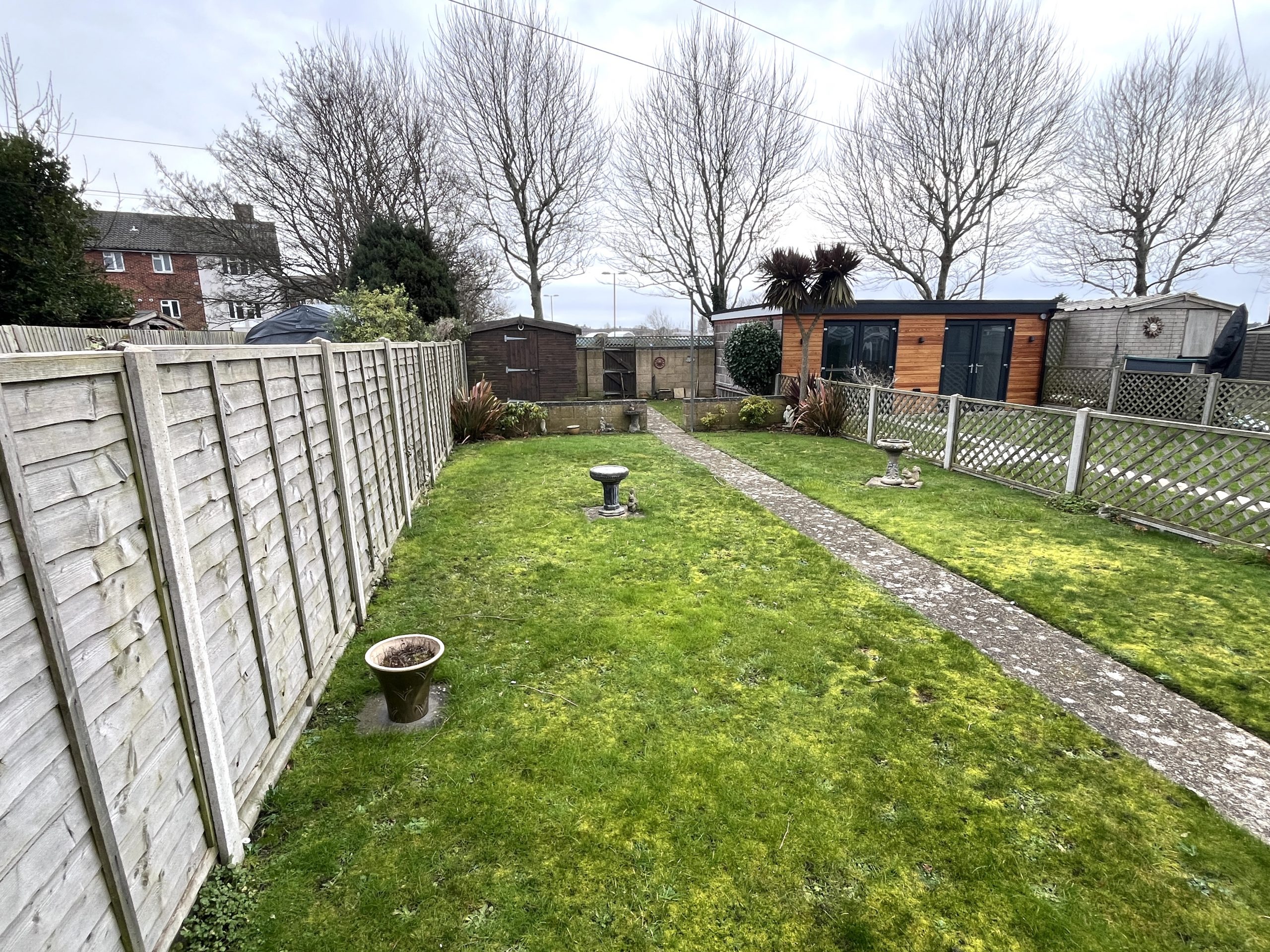 Paved patio and pathway, raised lawn with shrub borders. Two sheds, timber fencing and walling, side gate leading;