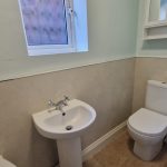 8’ (2.43m) x 5’5 (1.65m). Maximum Measurements. Panel bath with shower over and stone style solid surface surround. Hand wash basin, WC, heated towel rail, extractor fan, vinyl style floor.