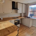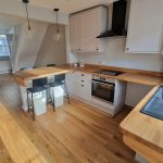 9’3 (2.81m) x 8’1 (2.46m). Wall and floor units, wood worktops with matching surrounds, 1 1/2 sink with drainer and mixer tap, built in oven with electric hob and extractor fan over. Space for fridge/freezer and washer/dryer. Breakfast counter with pendant lights. Door to rear garden.