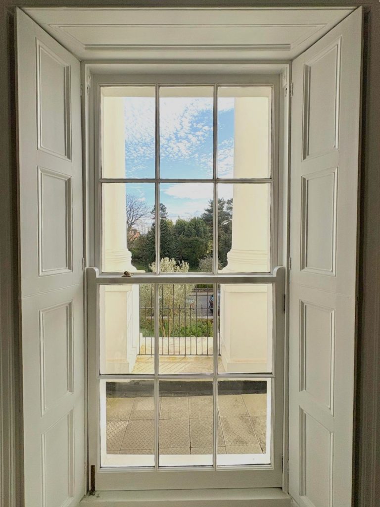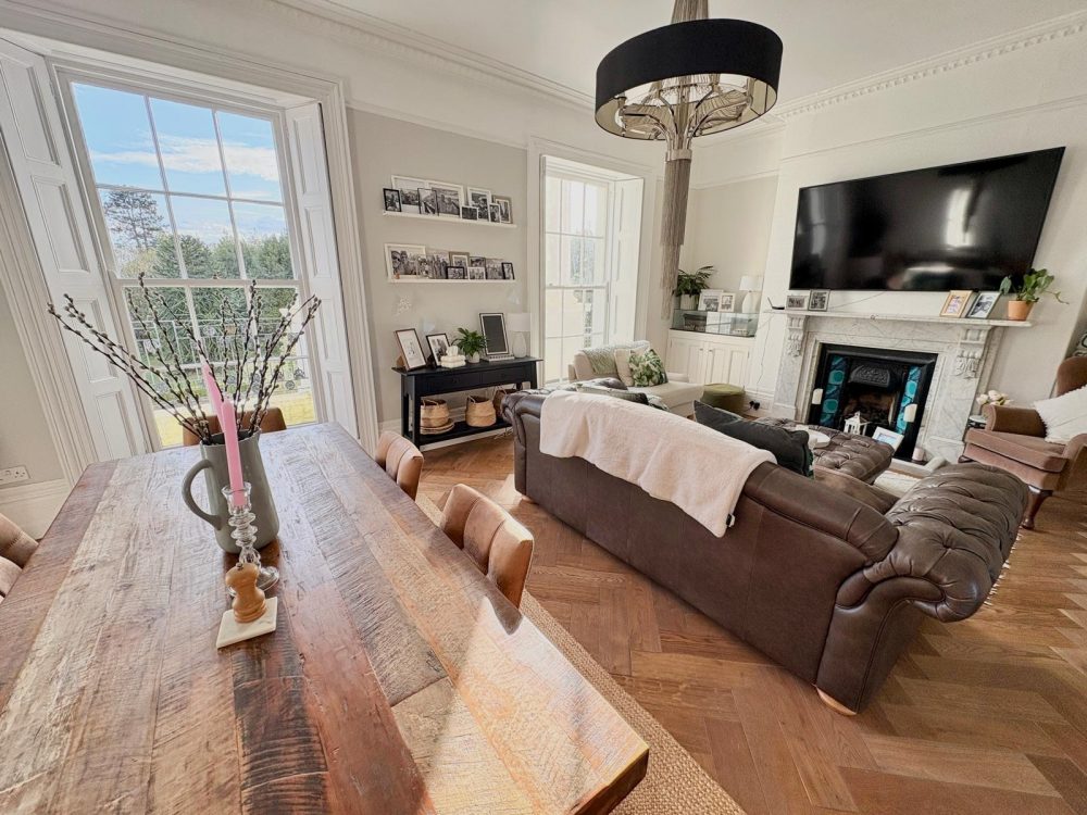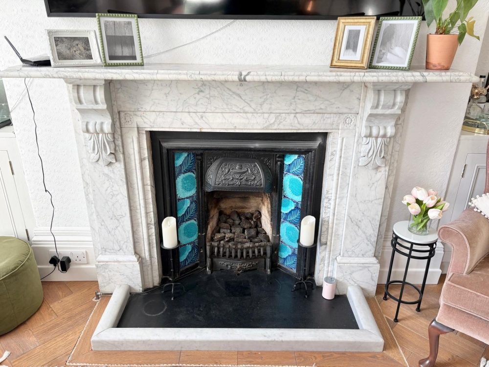 22’5 (6.83m) x 19’9 (6.02m), two full height sash windows with access to balcony, window shutters. Marble fireplace, ceiling rose and mouldings. Built in cupboards, two radiators and herringbone wood effect flooring.
