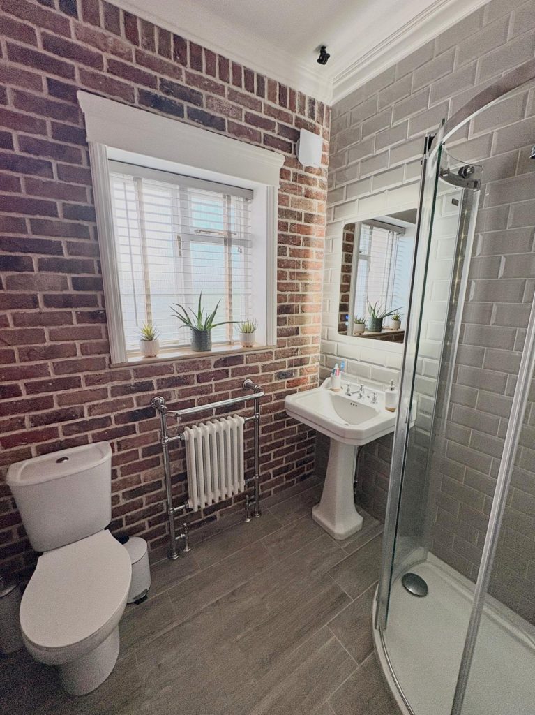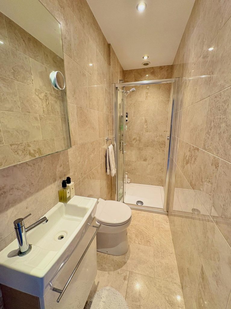 6’9 (2.06m) x 5’9 (1.75m), shower, WC, wash hand basin, heated towel rail/radiator, part tiled walls and laminate style flooring.