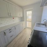 9’9 (2.97m) x 7’2 (2.18m). Double glazed window to the side elevation. Fitted wall and floor cabinets, sink and drainer with mixer taps, tiled surrounds. Electric cooker with hob and extractor over, Space for washing machine, door to conservatory.