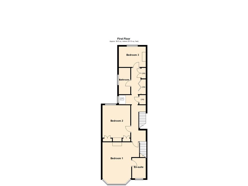 Laminate style flooring to stairs and landing and stairs to and landing. Range of built in storage cupboards, lift from ground floor, two radiators and loft hatch.