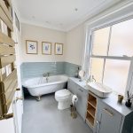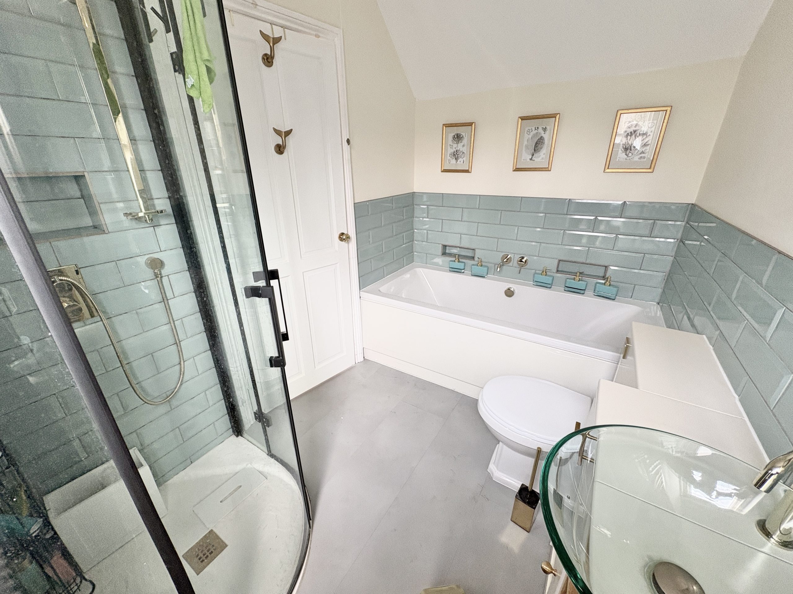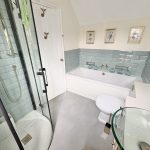 11’10 (3.38m) x 5’3 (1.61m), bath, separate shower, sink unit and WC. Part tiled walls, heated towel rail and laminate style flooring.