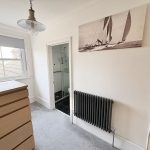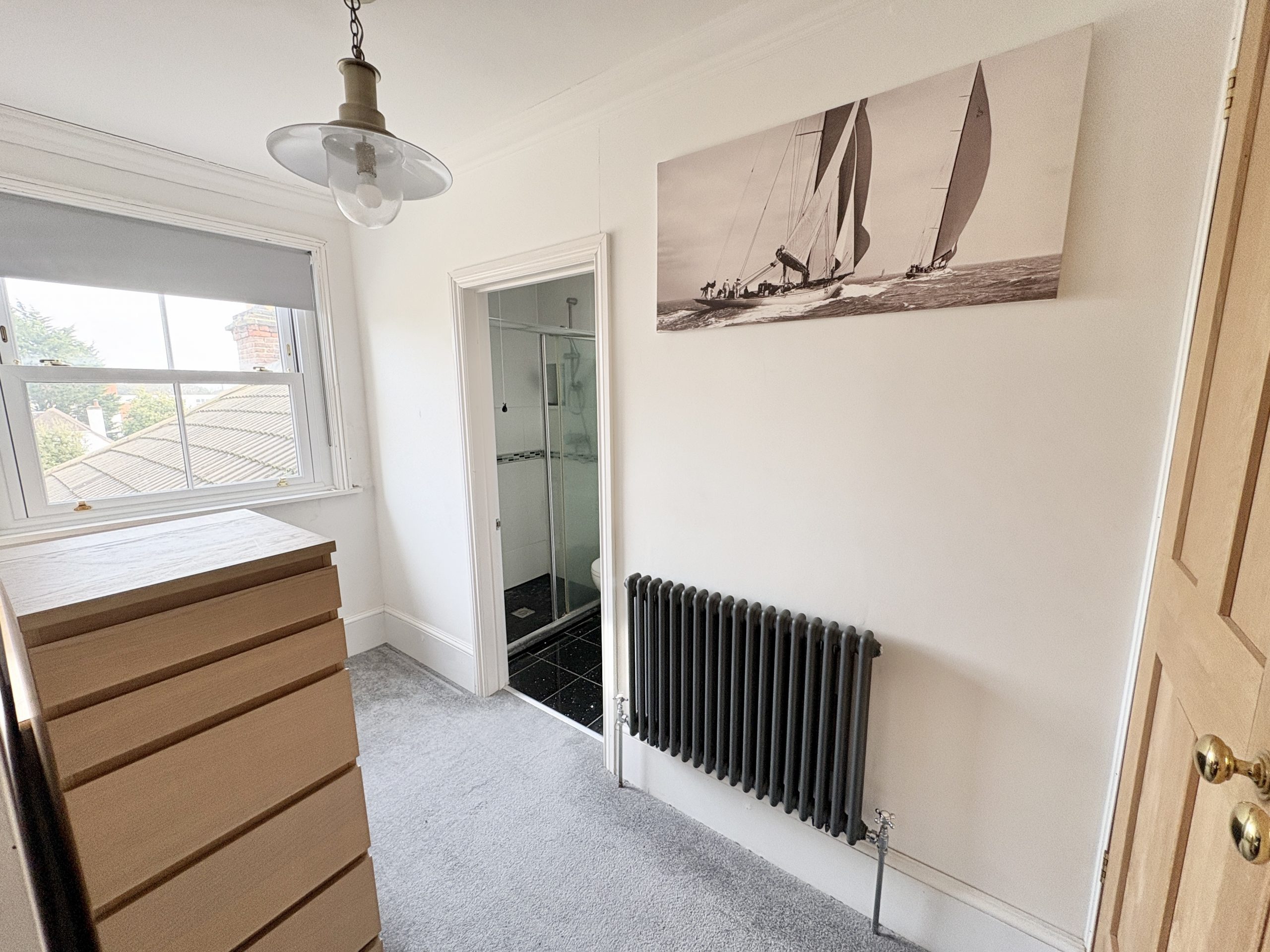 12’9 (3.93m) x 4’9 (1.49m), built in cupboards, caret, radiator and door to; En-suite, 6’1 (1.85m) x 4’9 (1.49m), shower, sink unit and WC, light tunnel, tiling to walls and floor.