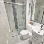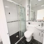 6’1 (1.85m) x 4’9 (1.49m), shower, sink unit and WC. Light tunnel and tiling to walls and floor.
