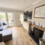 Fireplace with recessed wood burner, matching built in cupboards with solid wood tops.  Radiator, laminate style flooring and French doors to rear garden.