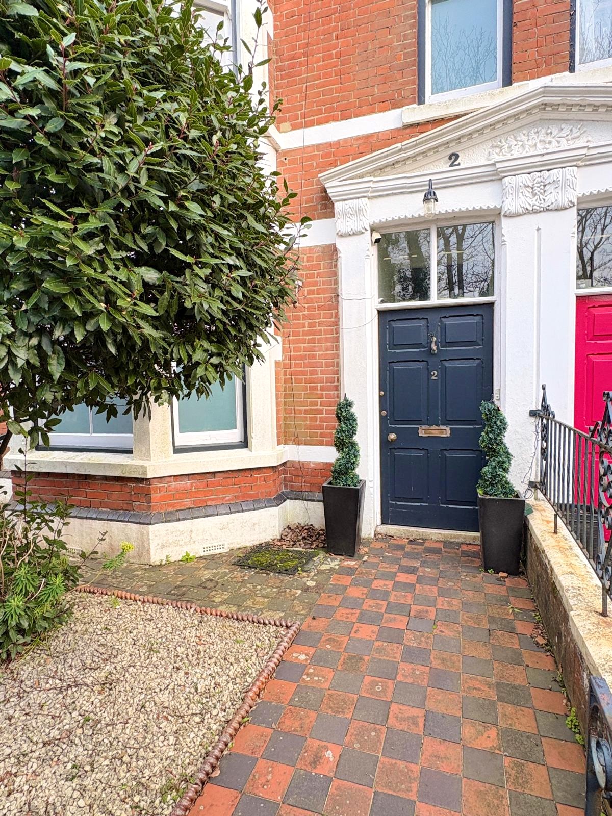 Walled, railings, mainly laid to shingle and tiled pathway.