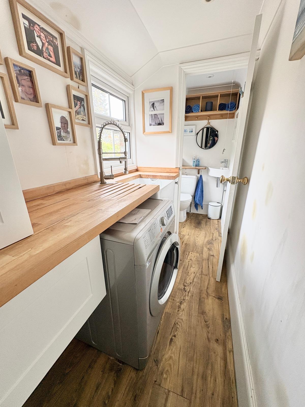 7’3 (2.22m) x 3’11 (0.94m), Lobby with radiator, laminate style floor and French doors to rear garden. Butlers style sink, solid wood work tops with matching upstands, space for washing machine and laminate style flooring.