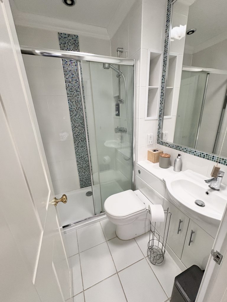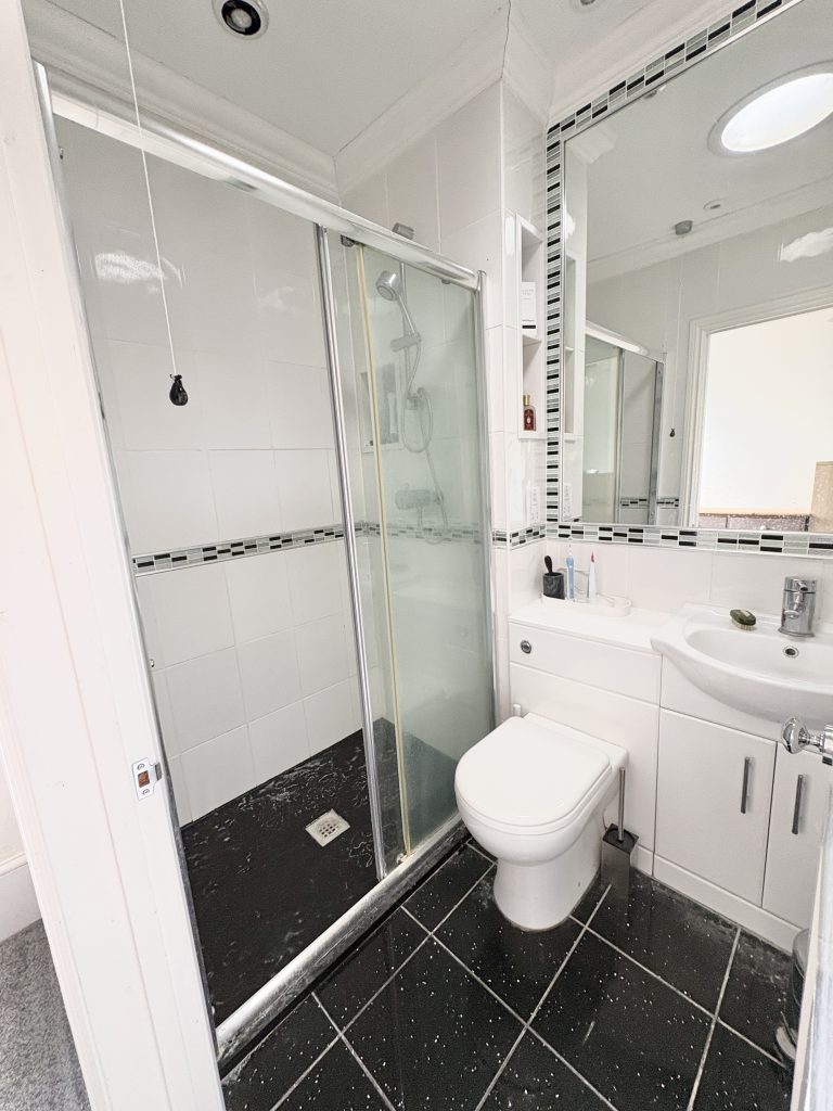 6’1 (1.85m) x 4’9 (1.49m), shower, sink unit and WC. Light tunnel and tiling to walls and floor.