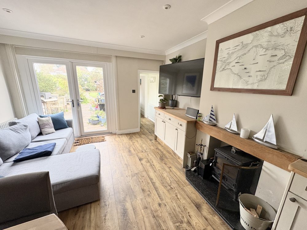 Fireplace with recessed wood burner, matching built in cupboards with solid wood tops. Radiator, laminate style flooring and French doors to rear garden.