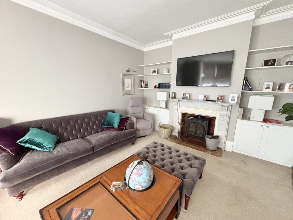 19’4 (5.91m) into bay x 14’7 (4.48m), fireplace with recessed wood burner, built in cupboards, radiator and carpet.