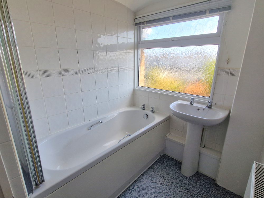 9’1 (2.76m) x 5’6 (1.67m), Maximum Measurements. Bath, electric shower over. Wash hand basin, radiator, vinyl flooring, linen cupboard and part tiled walls.