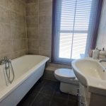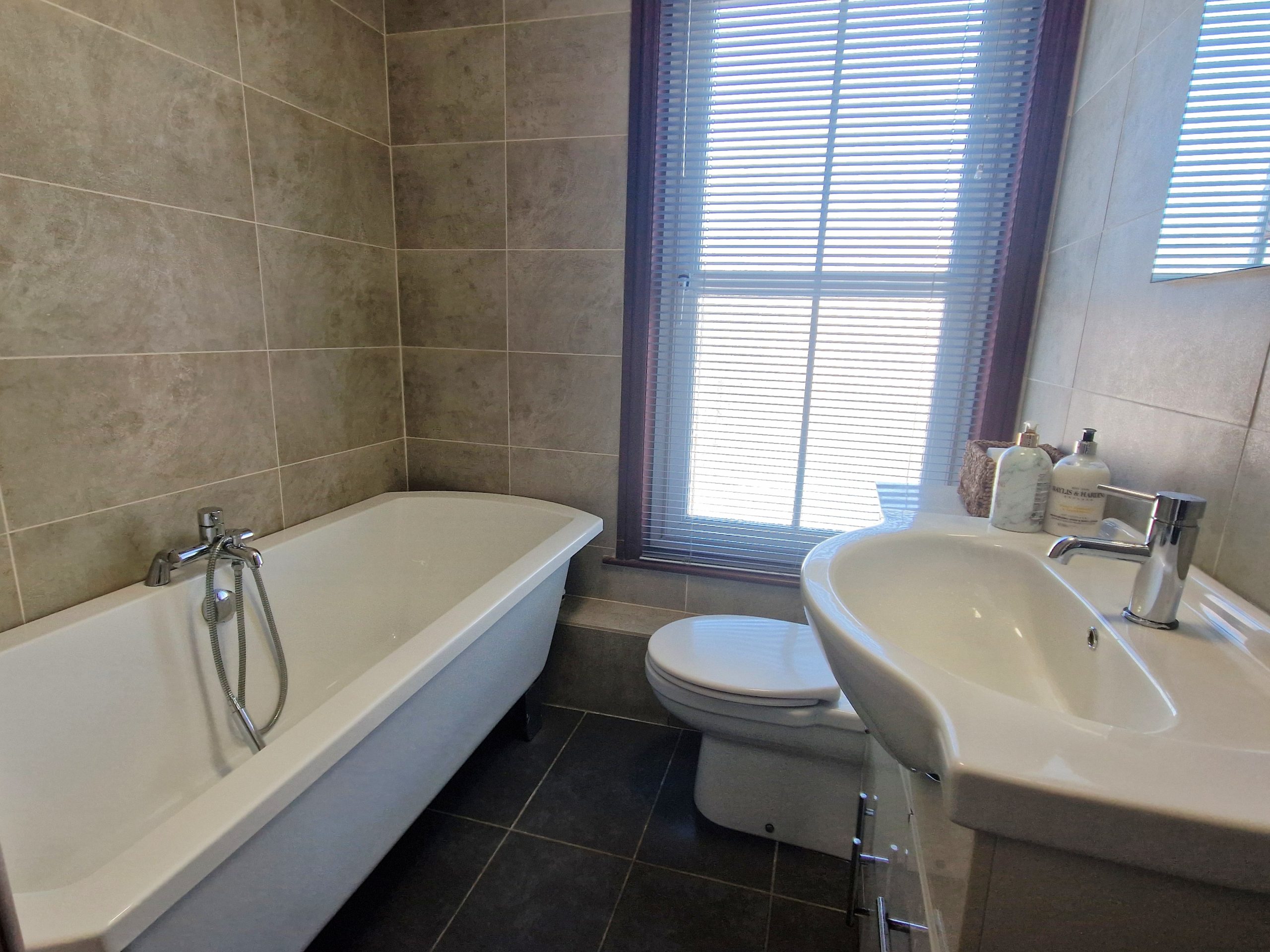 8’2 (2.48m) x 5’11 (1.80m), Maximum measurements. ‘P’ shaped panelled bath, mixer tap and shower attachment, shower screen. WC, wash hand basin, tiled walls and floor, chrome heated towel rail, spot lighting.