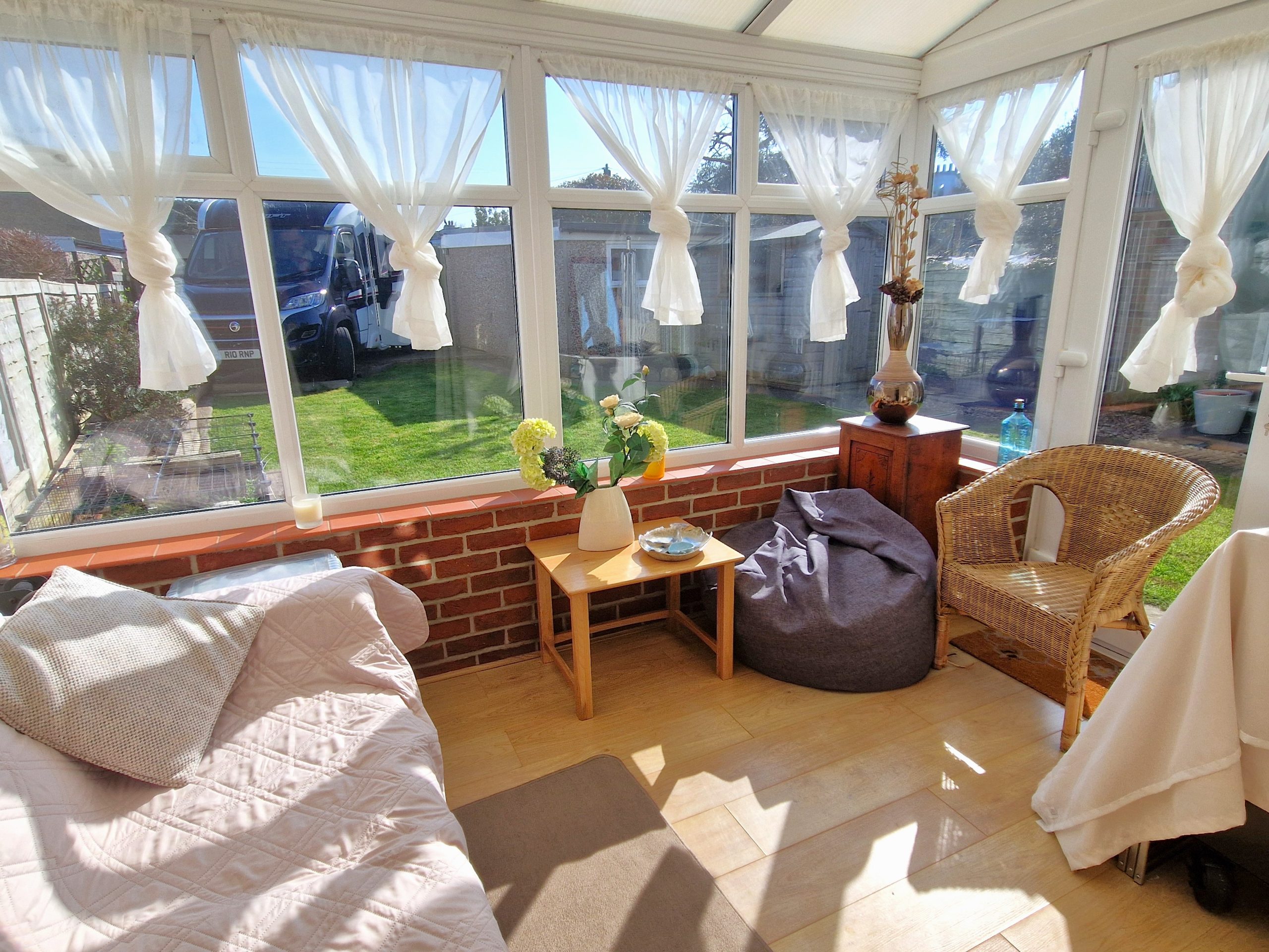 10’11 (3.32m) x 7’6 (2.28m), UPVC double glazed, polycarbonate style roof, wood effect flooring and door to garden.