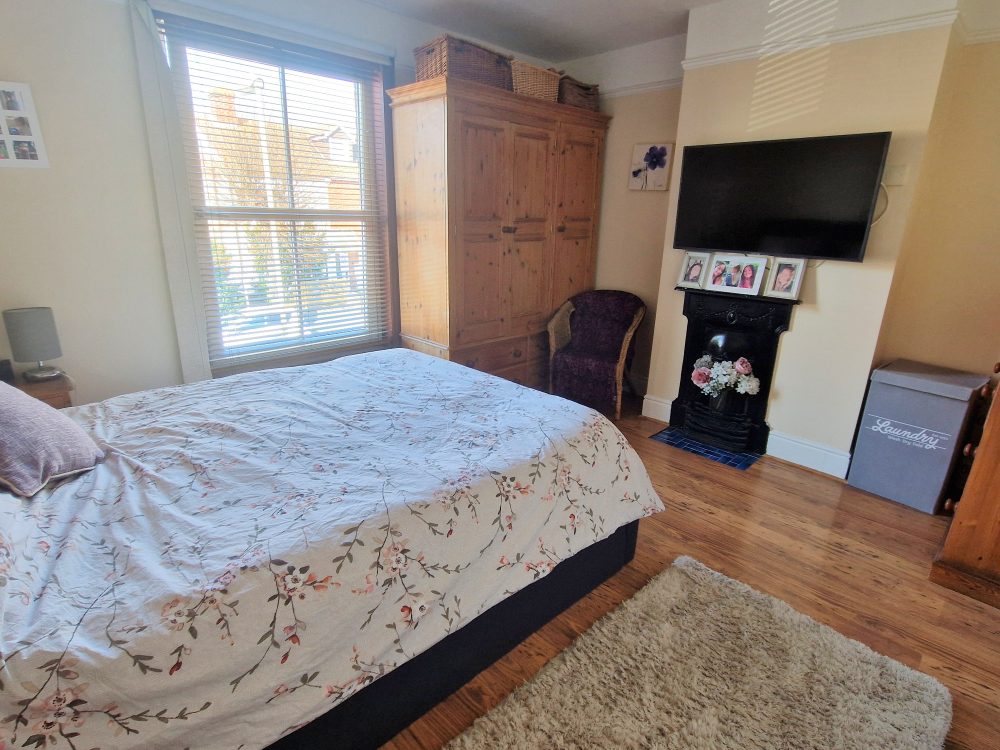 11’2 (3.40m) x 11’1 (3.37m), Cast fire place, built in wardrobe, laminate style floor.