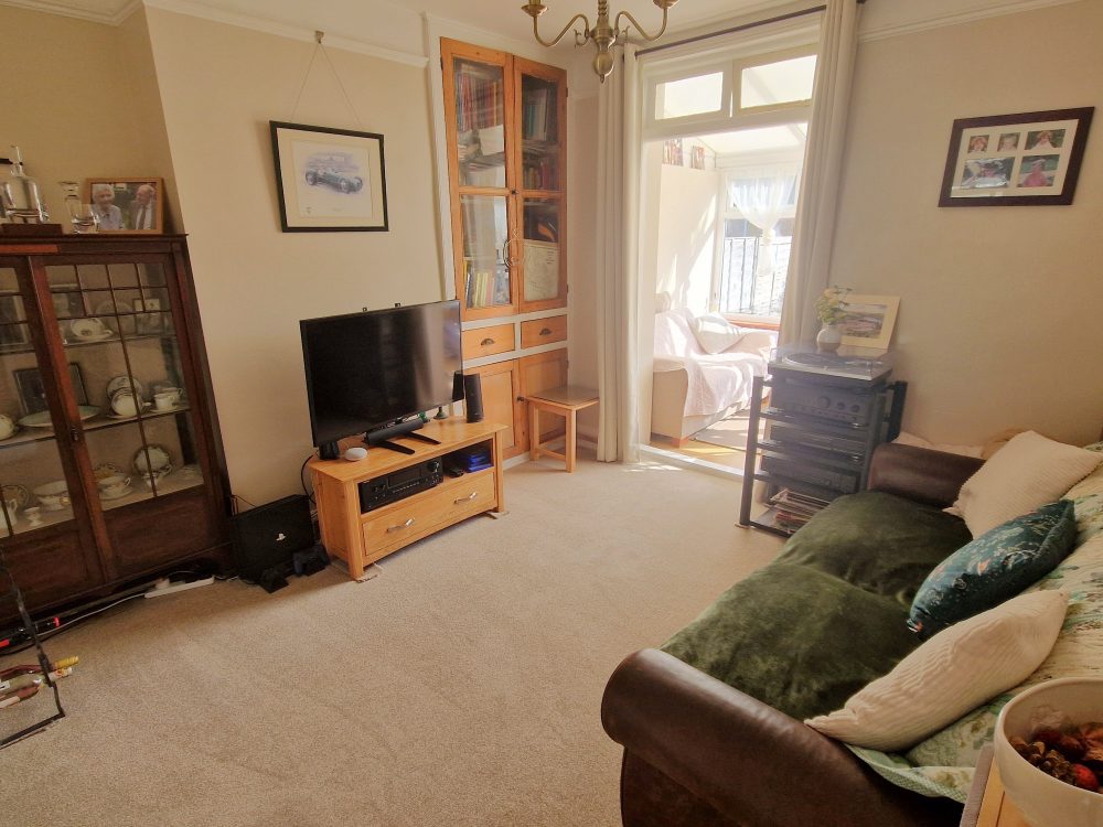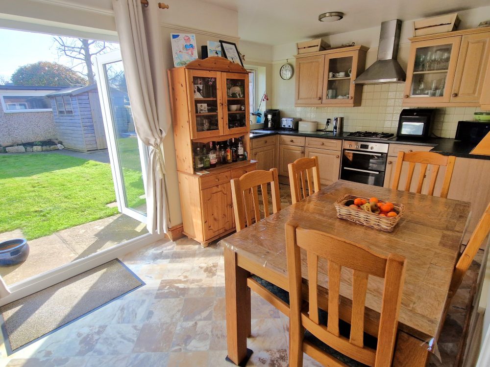 14’10 (4.52m) x 11’6 (3.50m), Maximum measurements. Wall and floor units, works surface, stainless steel sink drainer and mixer tap, tiled surrounds, hob and oven with cooker hood over. Radiator, vinyl style flooring and double doors to rear garden.