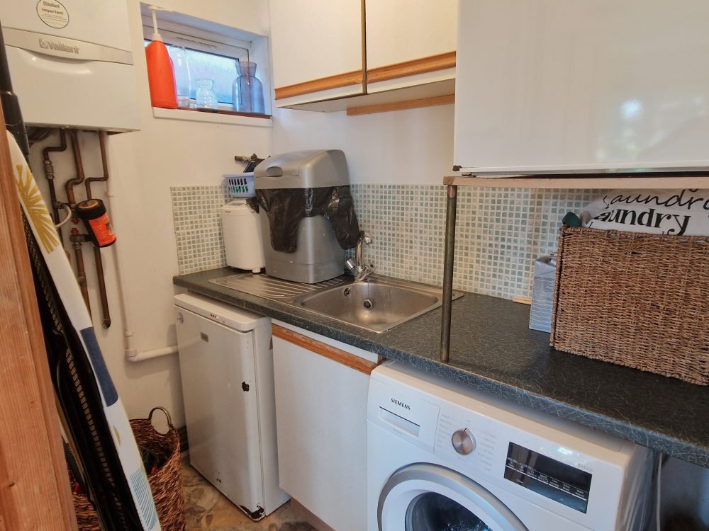 6’4 (1.93m) x 4’5 (1.34m), Wall and floor units, sink and drainer with mixer tap. Space for washing machine and freezer. Wall mounted gas fired boiler, door to garden.