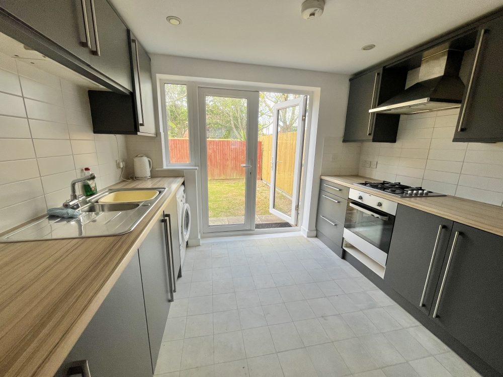 9’10 (m) x 8’8 (m), fitted with range of wall, floor and drawer units, worktops with matching upstands and tiling. Inset sink and drainer, gas hob and electric oven with cooker hood over, plumbing for washing machine, space for fridge/ freezer. Vinyl style flooring and double doors to garden.