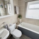 6’5 (1.95m) x 6’4 (1.93m), bath with shower over, shower screen, wash hand basin, WC, part tiled walls, radiator, vinyl style flooring, spot lighting and cupboard housing hot water tank.