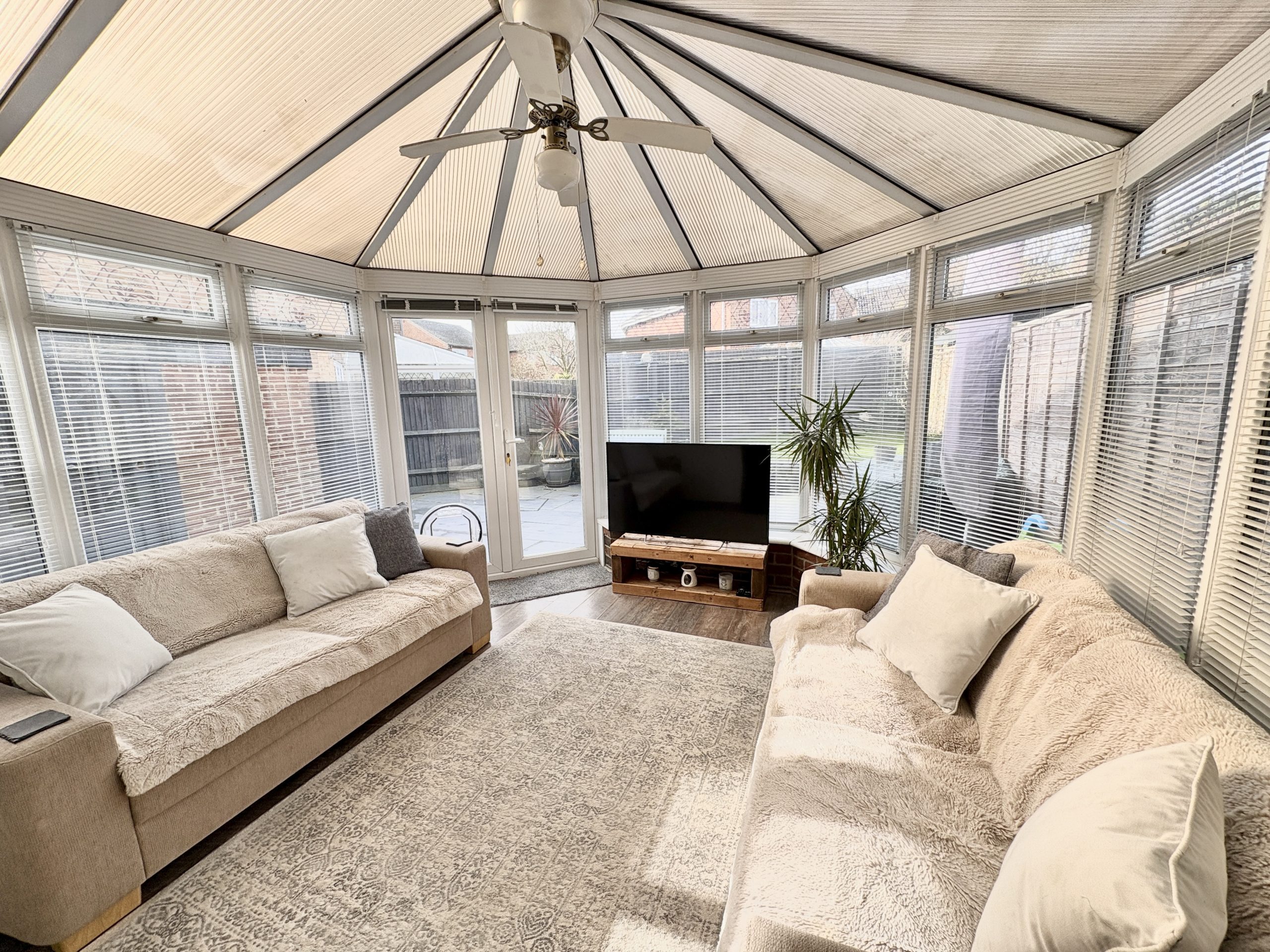 11’7 (3.53m) x 11’6 (3.50m), UPVC double glazed, polycarbonate style roof, laminate style flooring, French doors to rear garden.