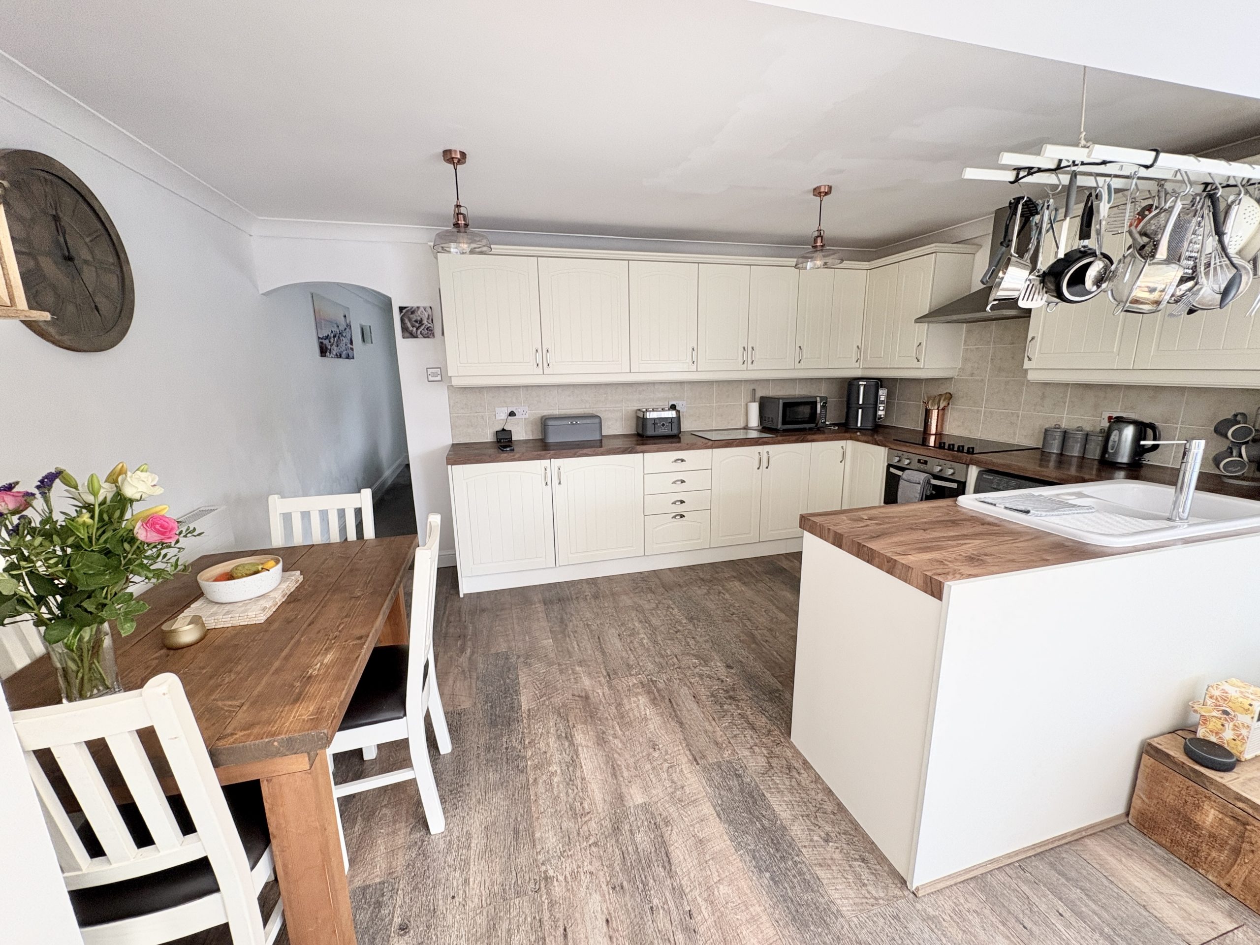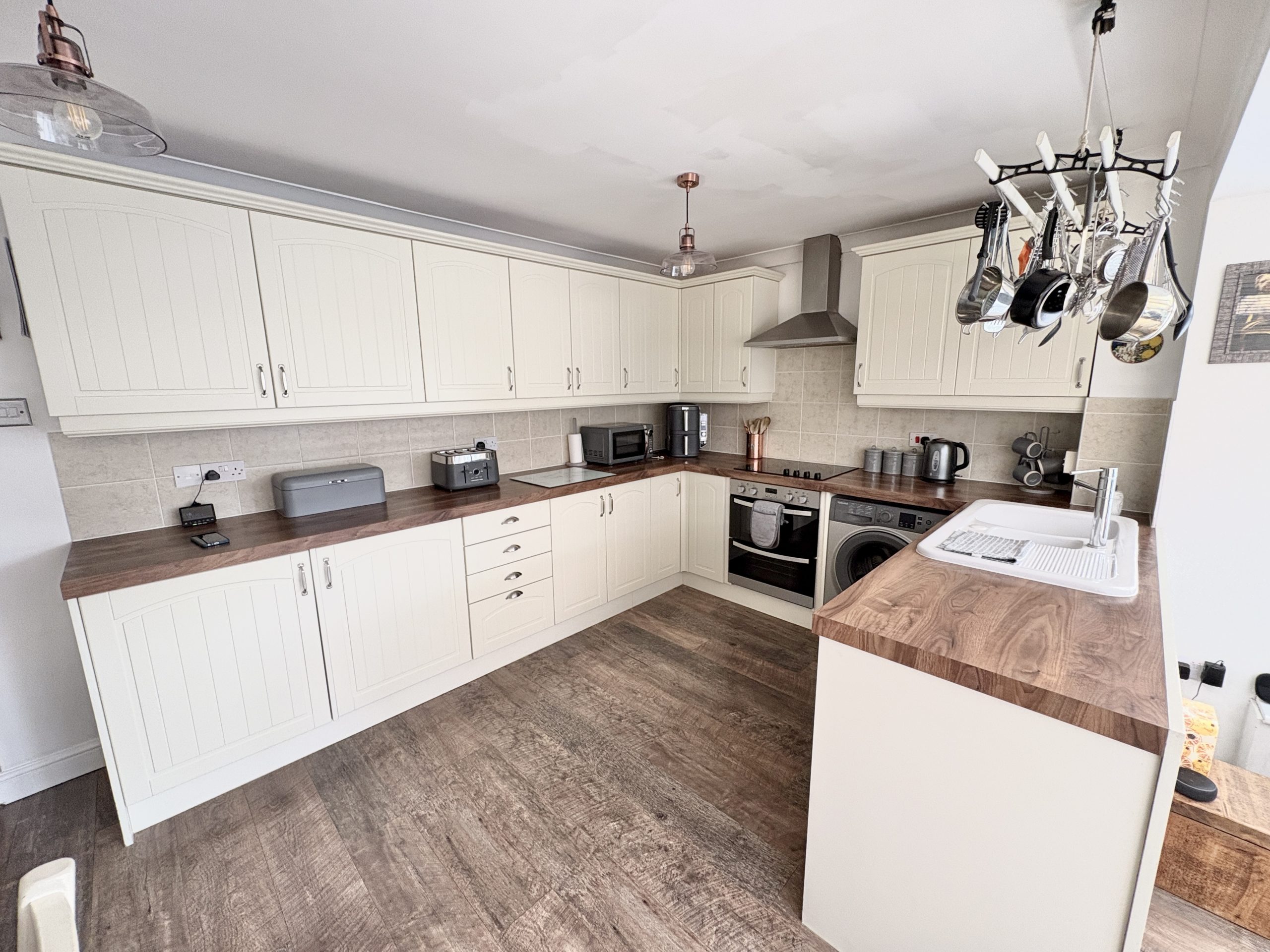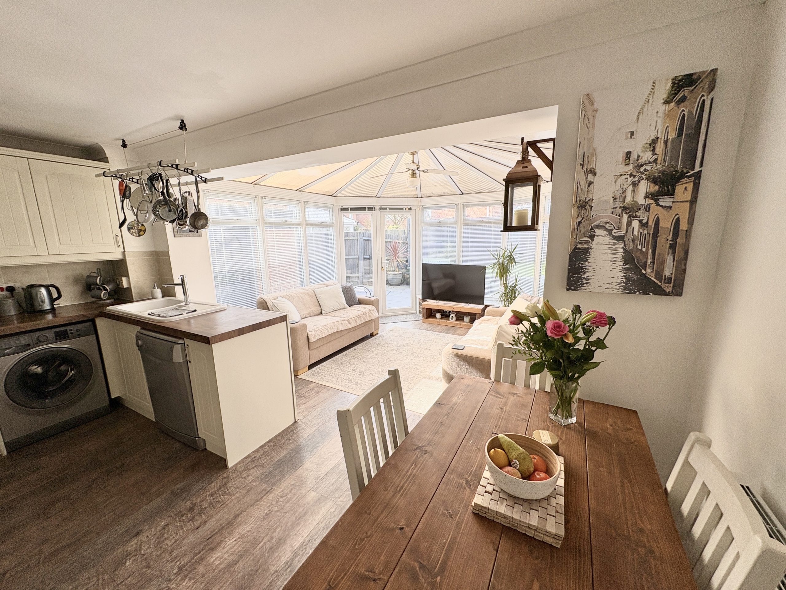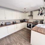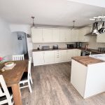 14’9 (4.49m) x 9’4 (2.84m), Wall and floor units, worktops, inset sink and drainer tiled splash backs, hob, cooker hood over, oven. Space for dishwasher and washing machine, matching fronted fridge and freezer, cupboard housing gas fired boiler. Laminate style flooring, radiator, room opening into;