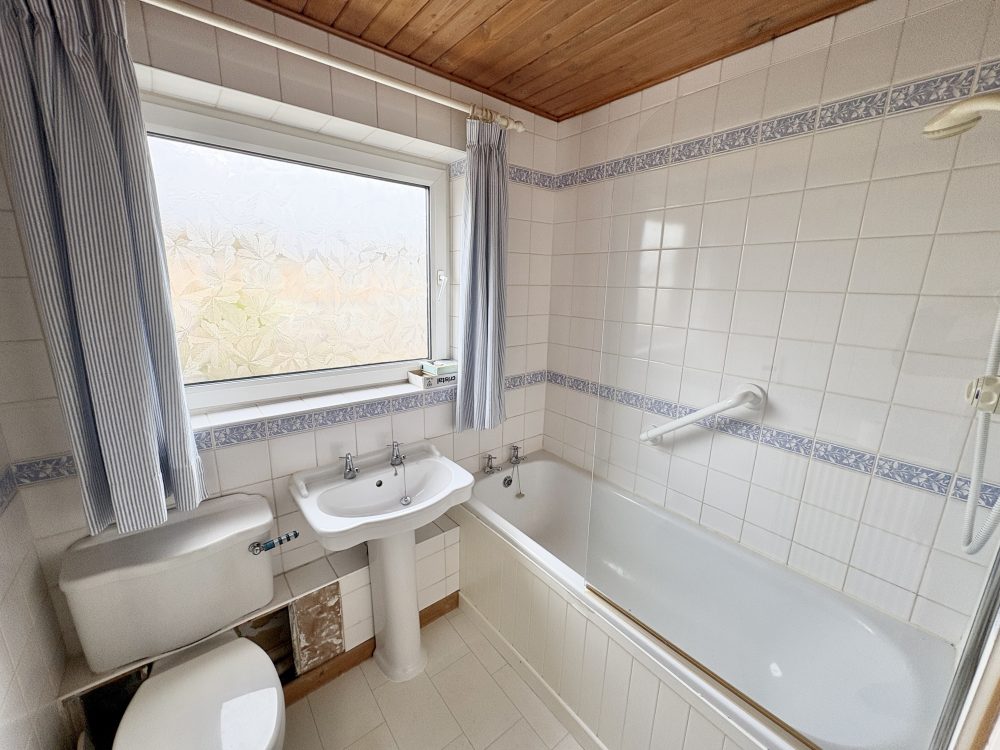 7’11 (2.41m) x 6’6 (1.98m), Panel bath with shower over, shower screen. WC, wash hand basin with storage cupboard under, chrome heated towel rail, tile floor and cupboard housing boiler.