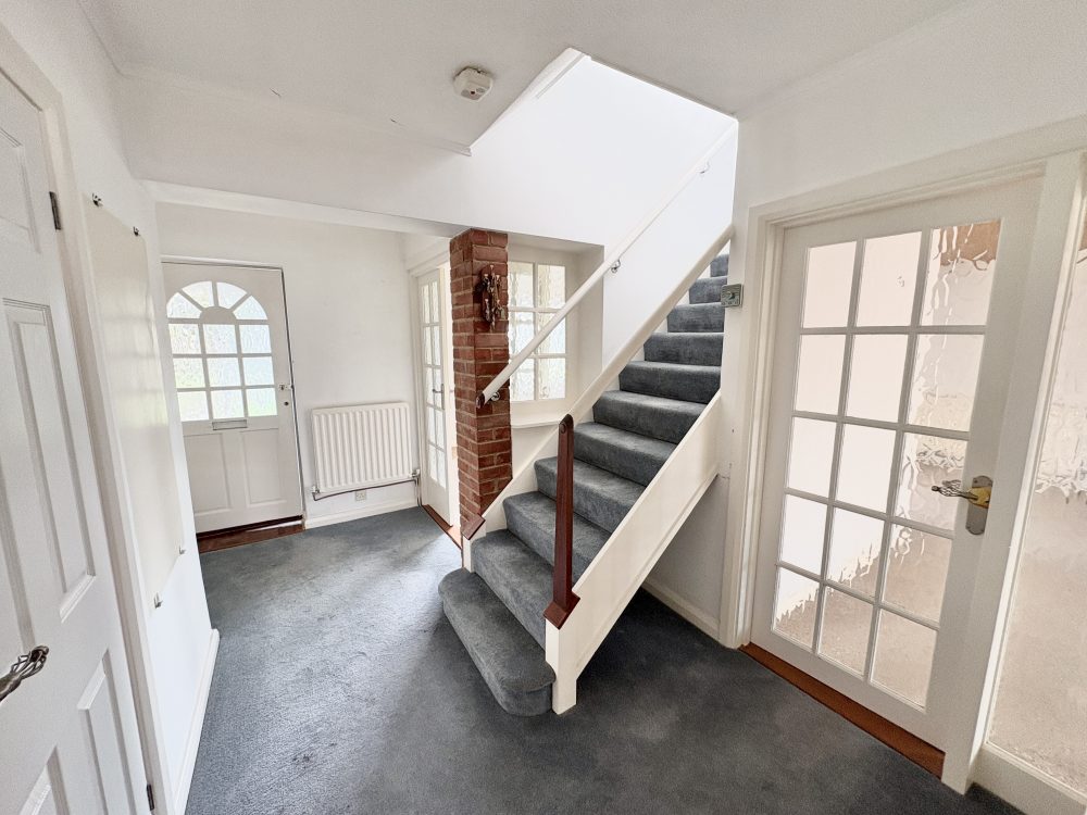 Stairs to first floor, cloaks cupboard, radiator, meter cupboard and carpet.