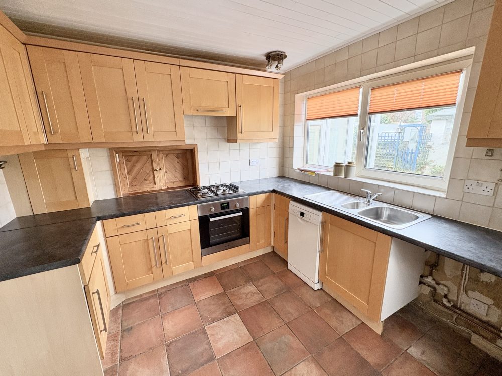 10’ (3.04m) x 9’8 (2.94m), Wall and floor units, worktops, tiled surrounds, inset 1-1/2 sink with drainer and mixer tap. Hob, oven and cooker hood over, space for fridge/freezer and washing machine, half sized dishwasher, serving hatch, tiled floor and door to; COVERED SIDE AREA 23’ (7.01m) x 5’11 (1.80m), average measurement. Polycarbonate style roof, paved floor and double doors to front and rear.