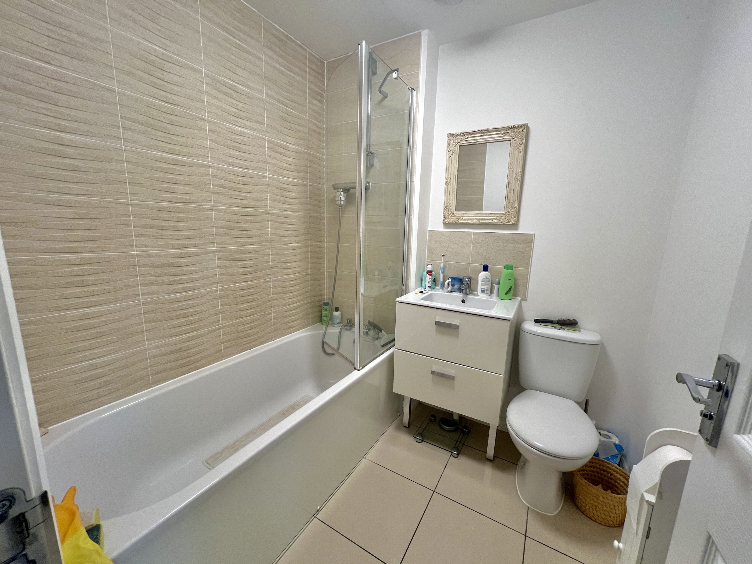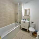 Fitted with white suite comprising panelled bath with taps and mixer shower, tiled walls, wash hand basin, tiled surrounds. WC. Radiator.