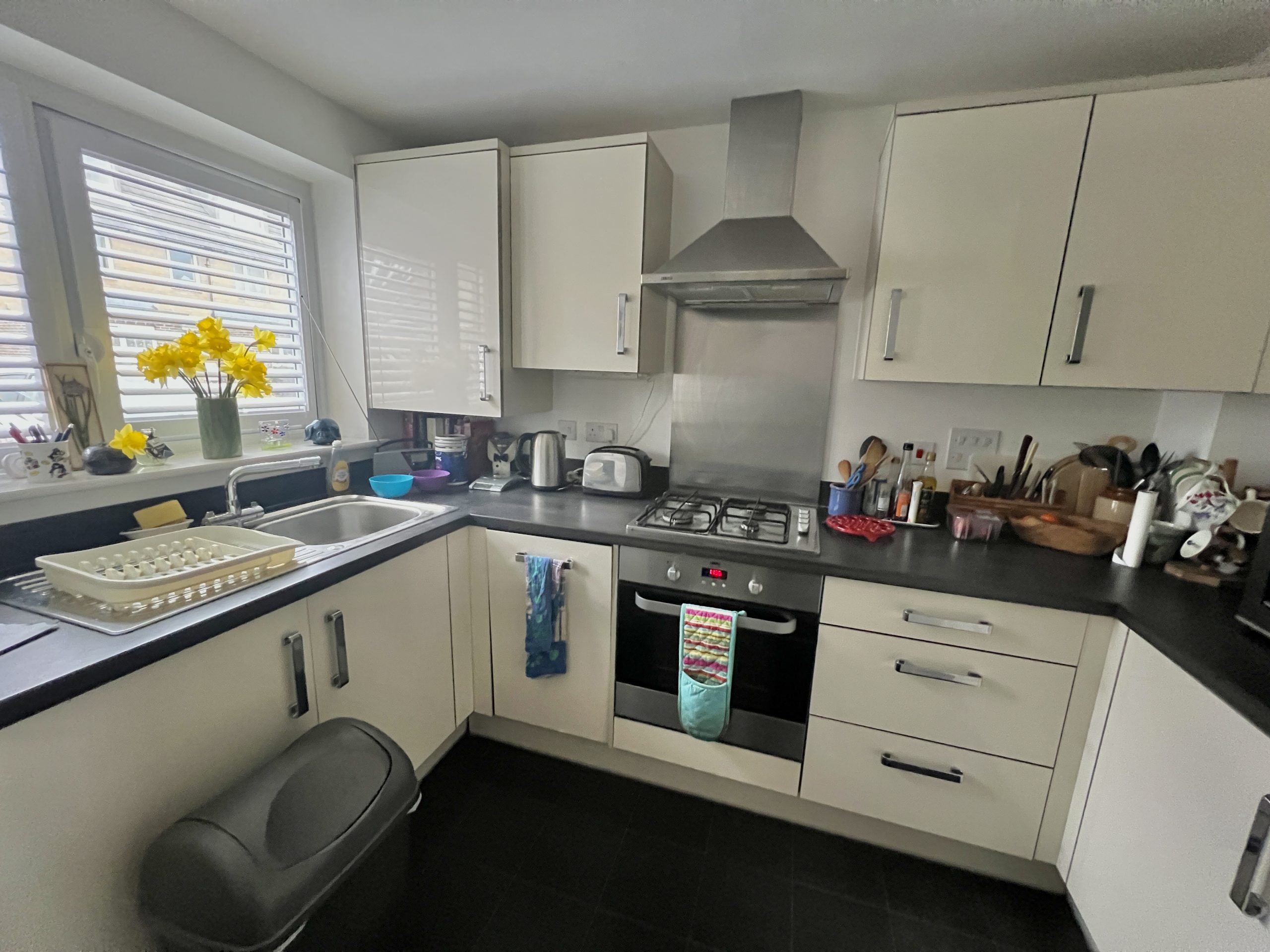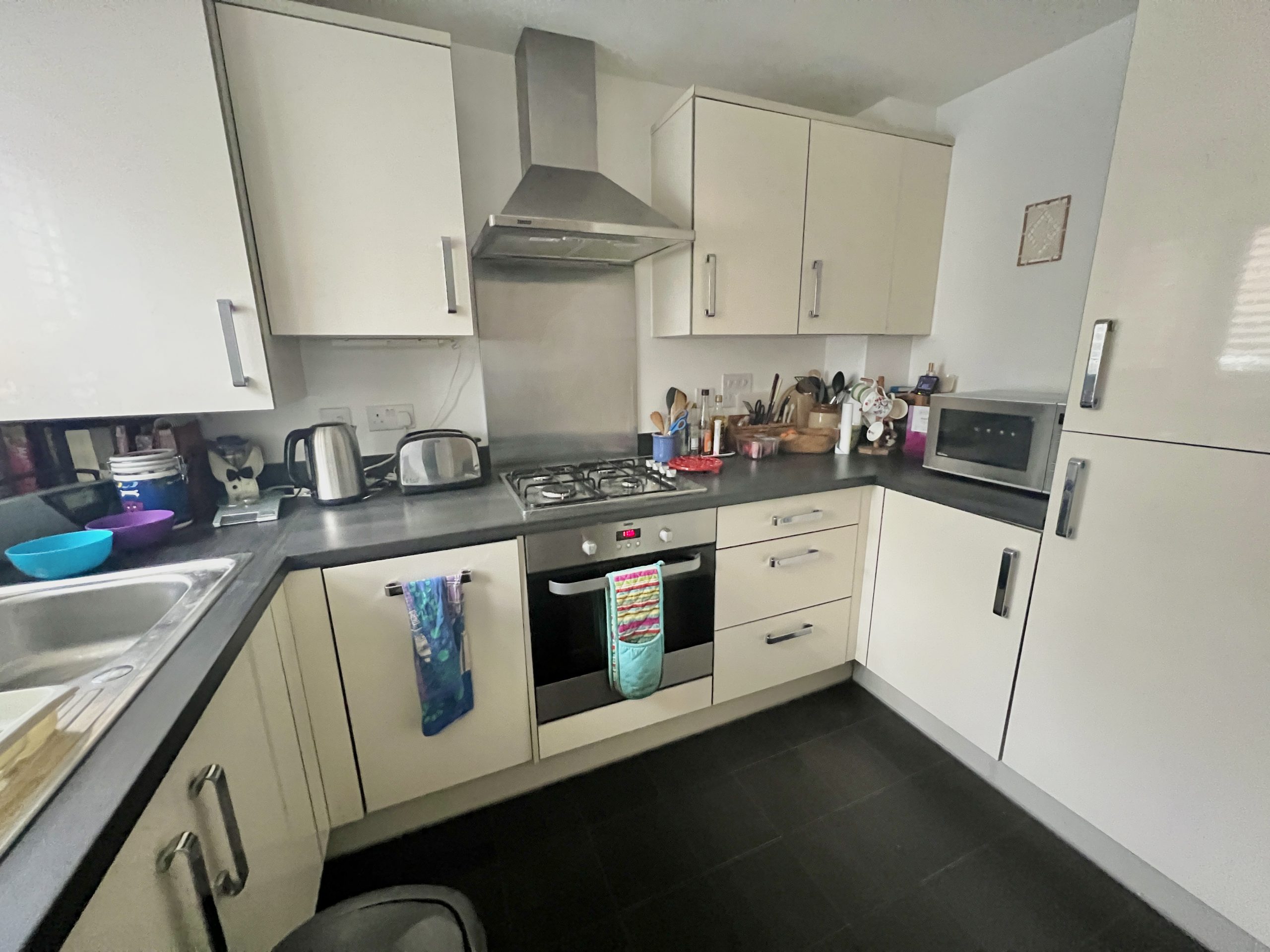 9’10 (3m) x 6 (1.83m) Double glazed window to the front elevation. Fitted with a range of matching wall & base units with contrasting work surfaces, inset sink unit. Built-in oven, hob & extractor. Integrated washing machine, fridge, freezer & slimline dishwasher units. Concealed wall mounted boiler.