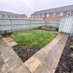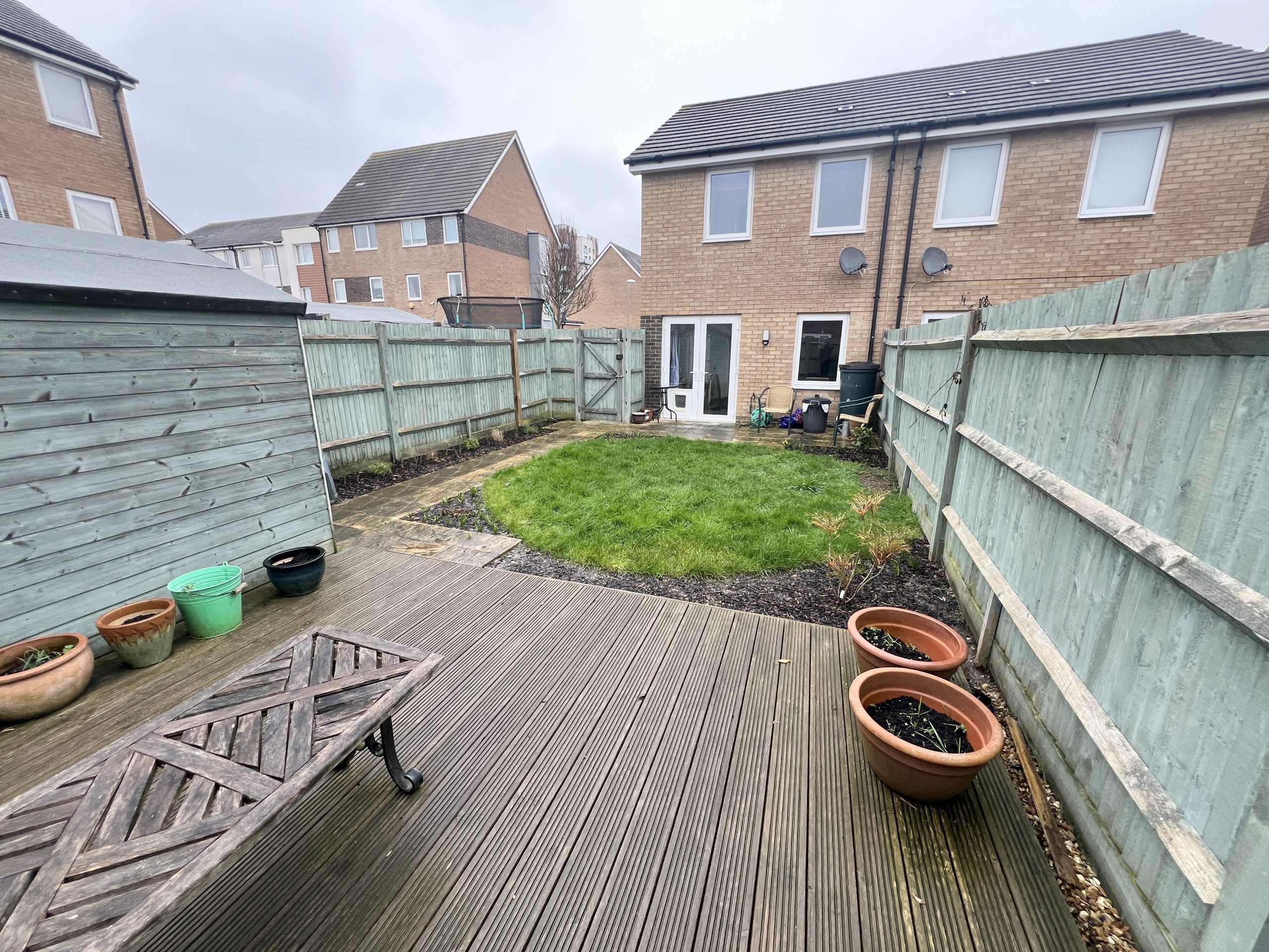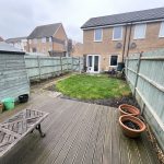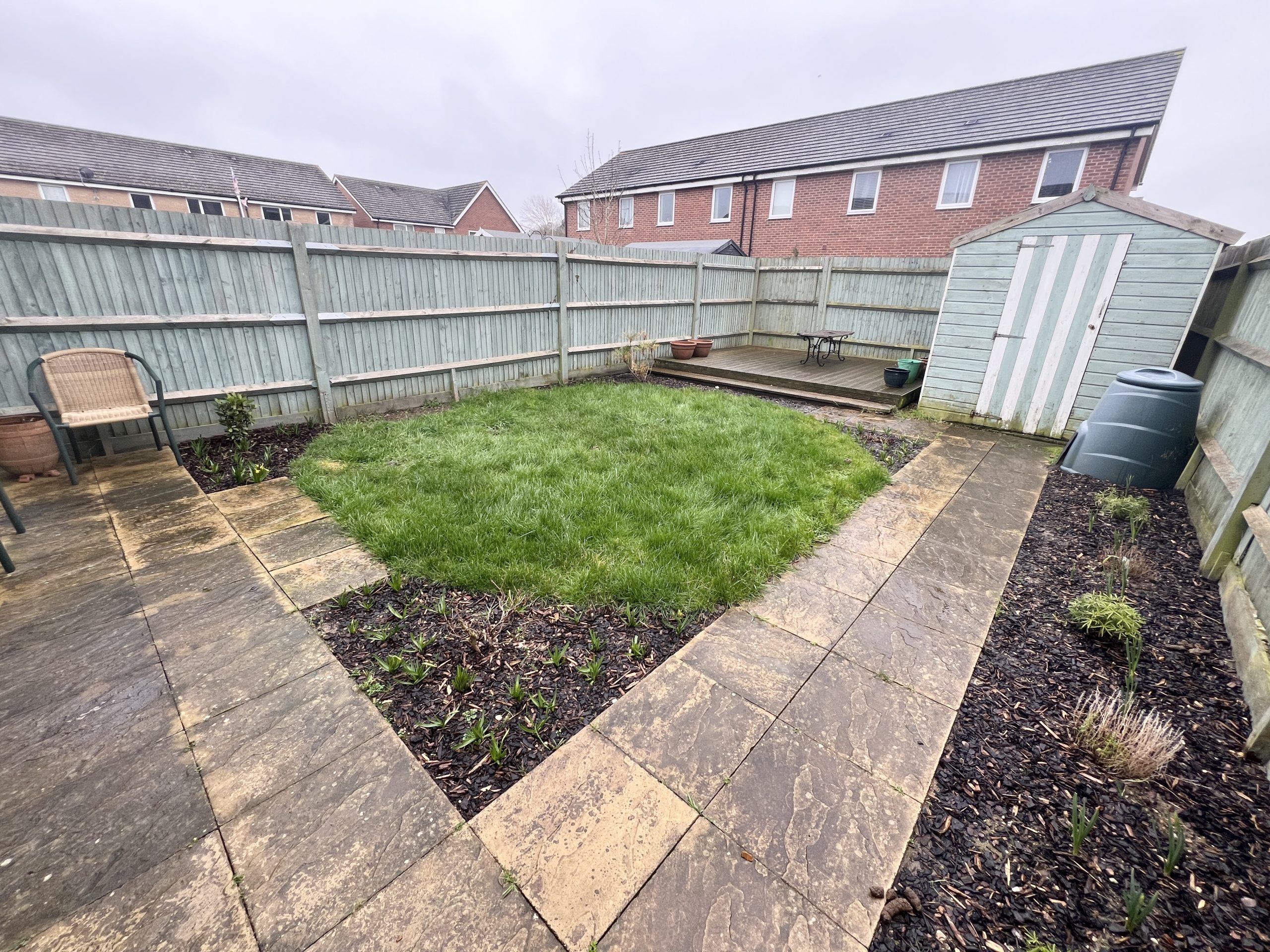 Enclosed ( by fencing ) rear garden, having a southerly aspect. Lawned & paved areas. Raised decking area. Timber shed. Outside tap & lighting.