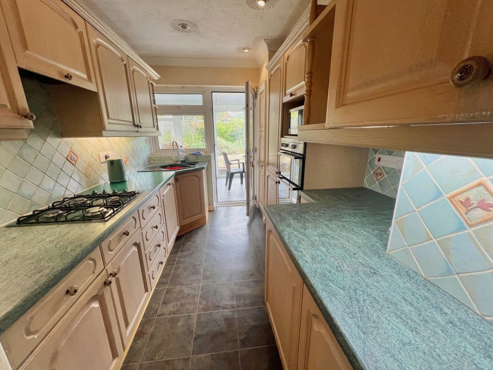 12 (3.66m) x 8 (2.44m) Double glazed window & door to the rear. Fitted with a range of wall & base cupboards, work tops and tiled surrounds. Built-in sink and drainer with mixer tap. Gas hob, with extractor over. Built-in oven & fridge/freezer.