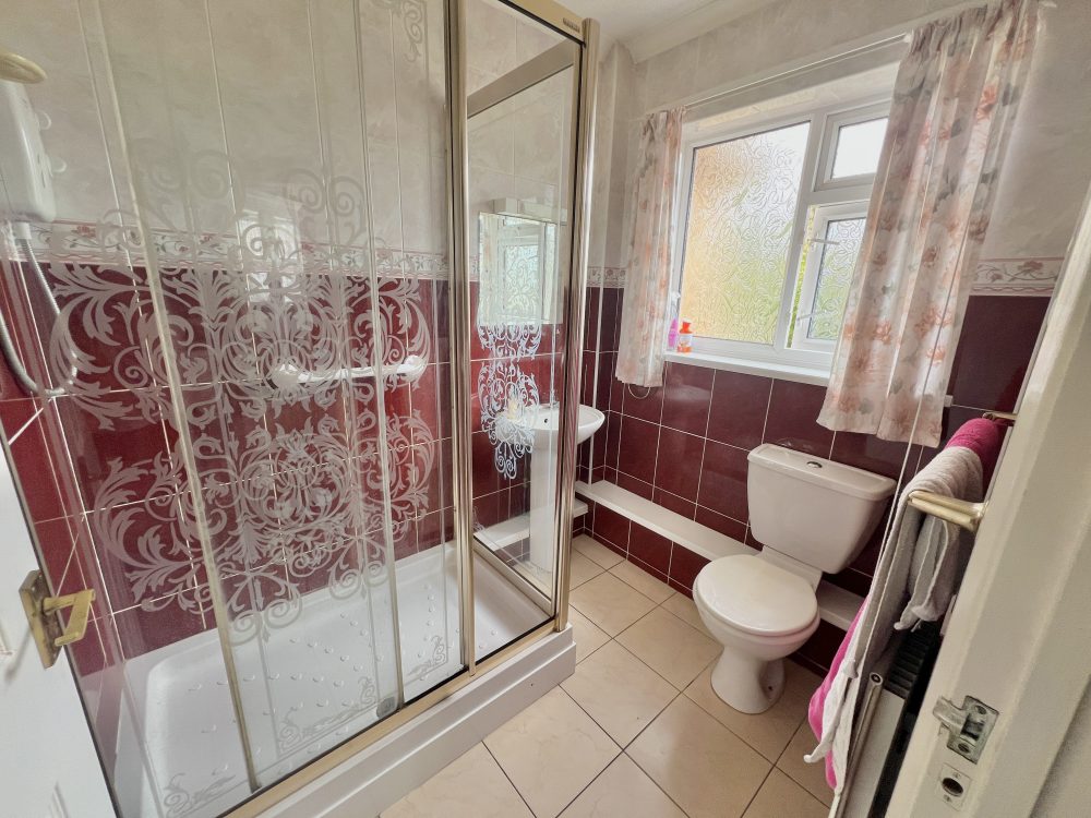 Double glazed window to the rear. Tiled shower cubicle with glass doors, WC, wash hand basin. Radiator, tiling to walls and floor.