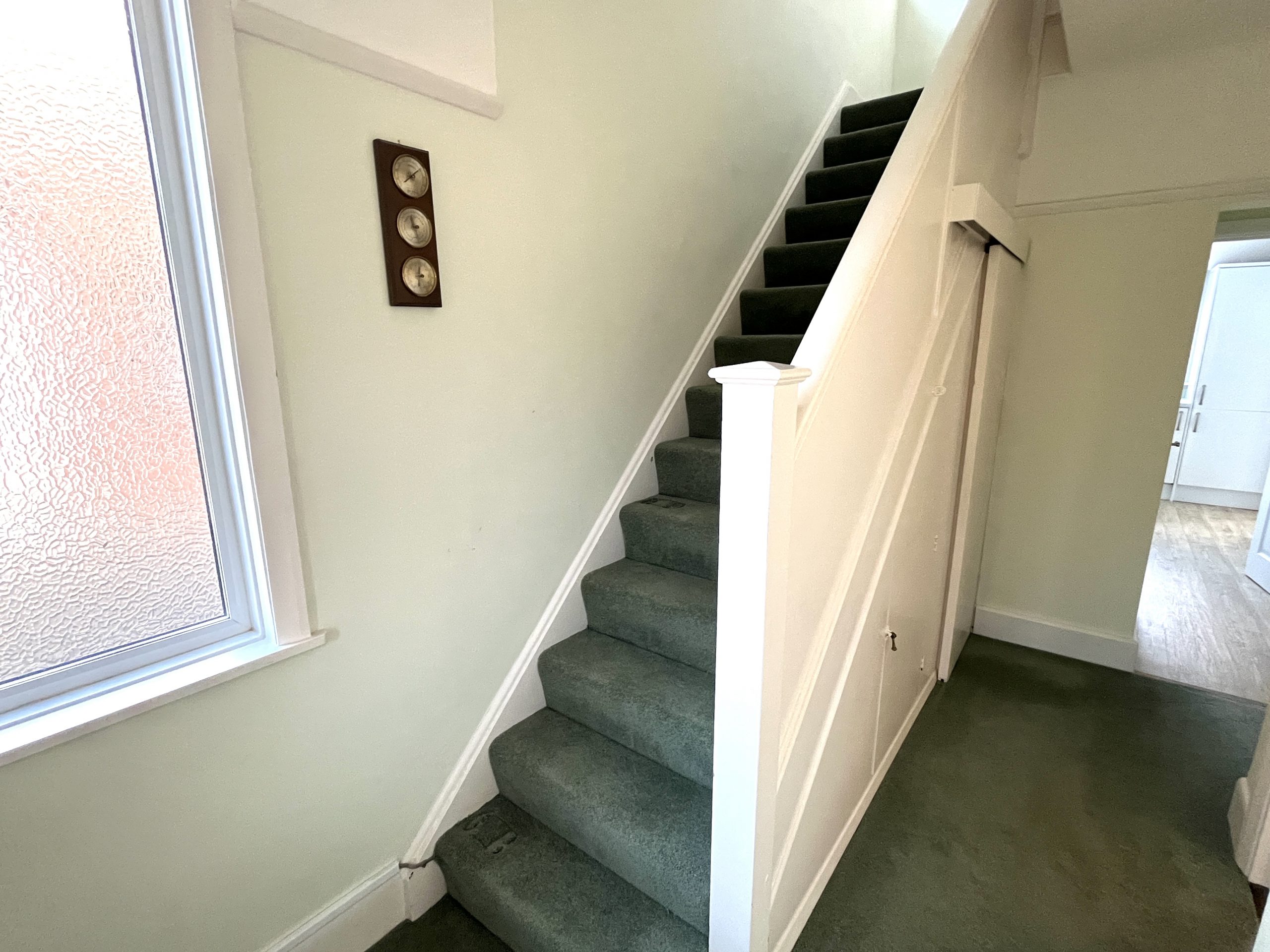 Storage heater, carpet, metre cupboard, stairs to first floor