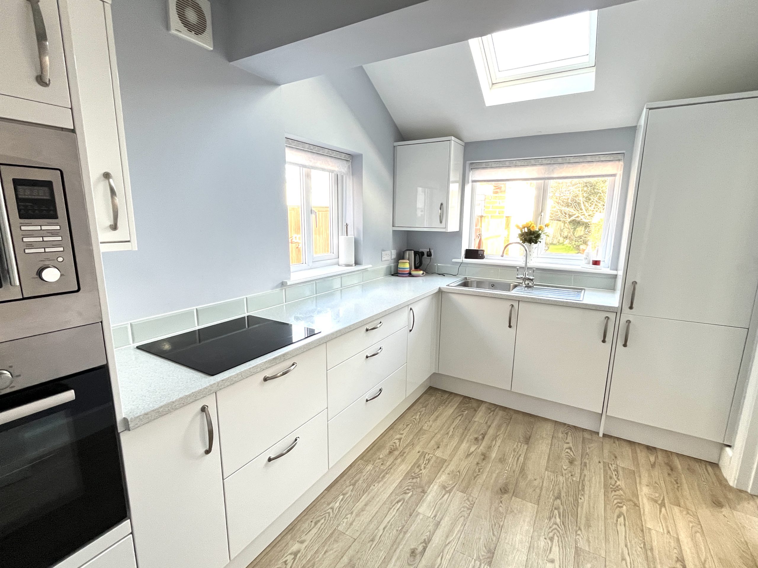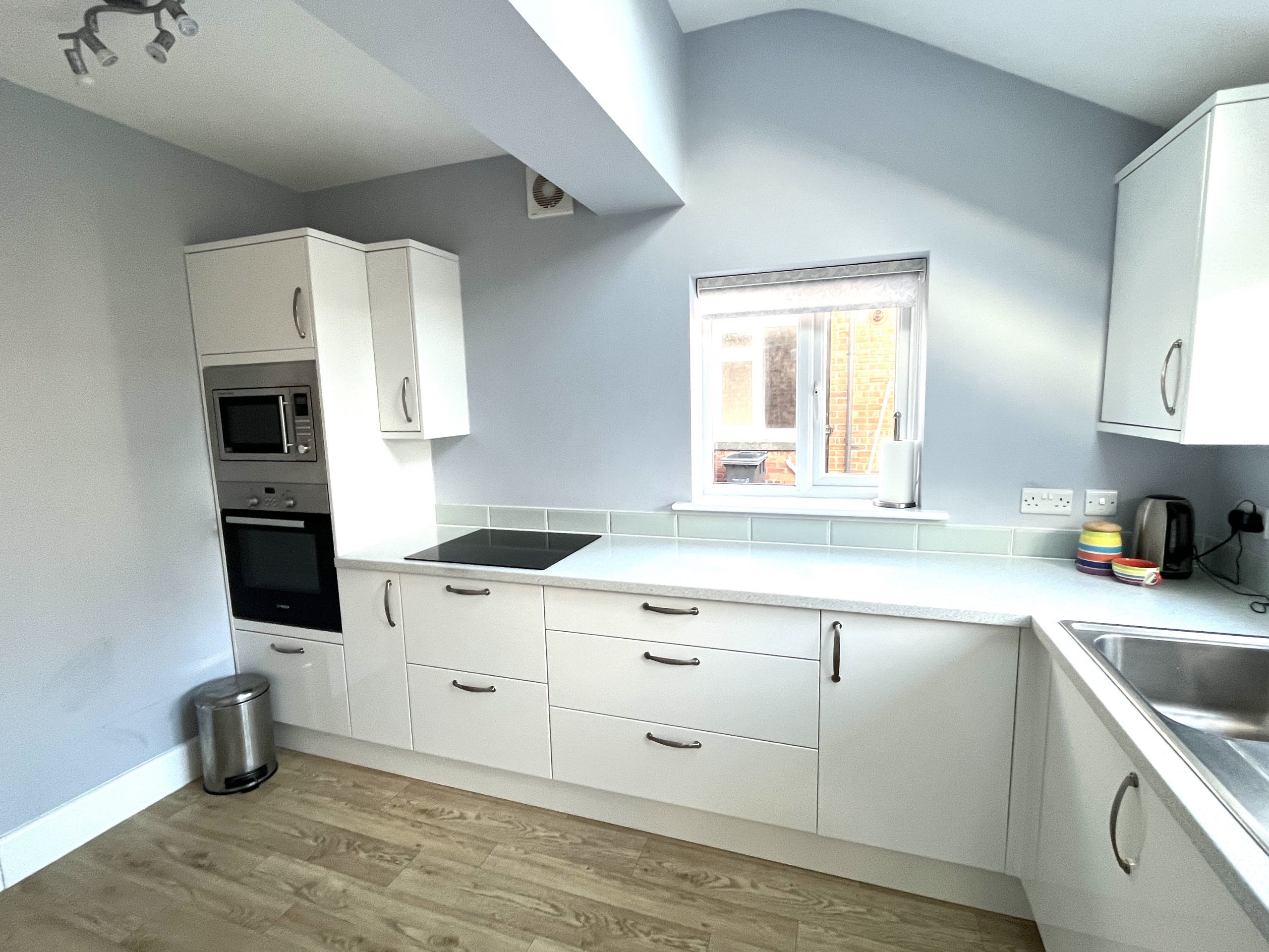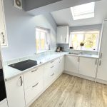 11’8 x 8’1 (3.55m x 2.46m) Maximum Measurements. Wall and floor units, work top, sink and drainer with mixer tap. Fridge/freezer, washing machine, electric hob and oven, sky light, vinyl style floor, extractor fan.